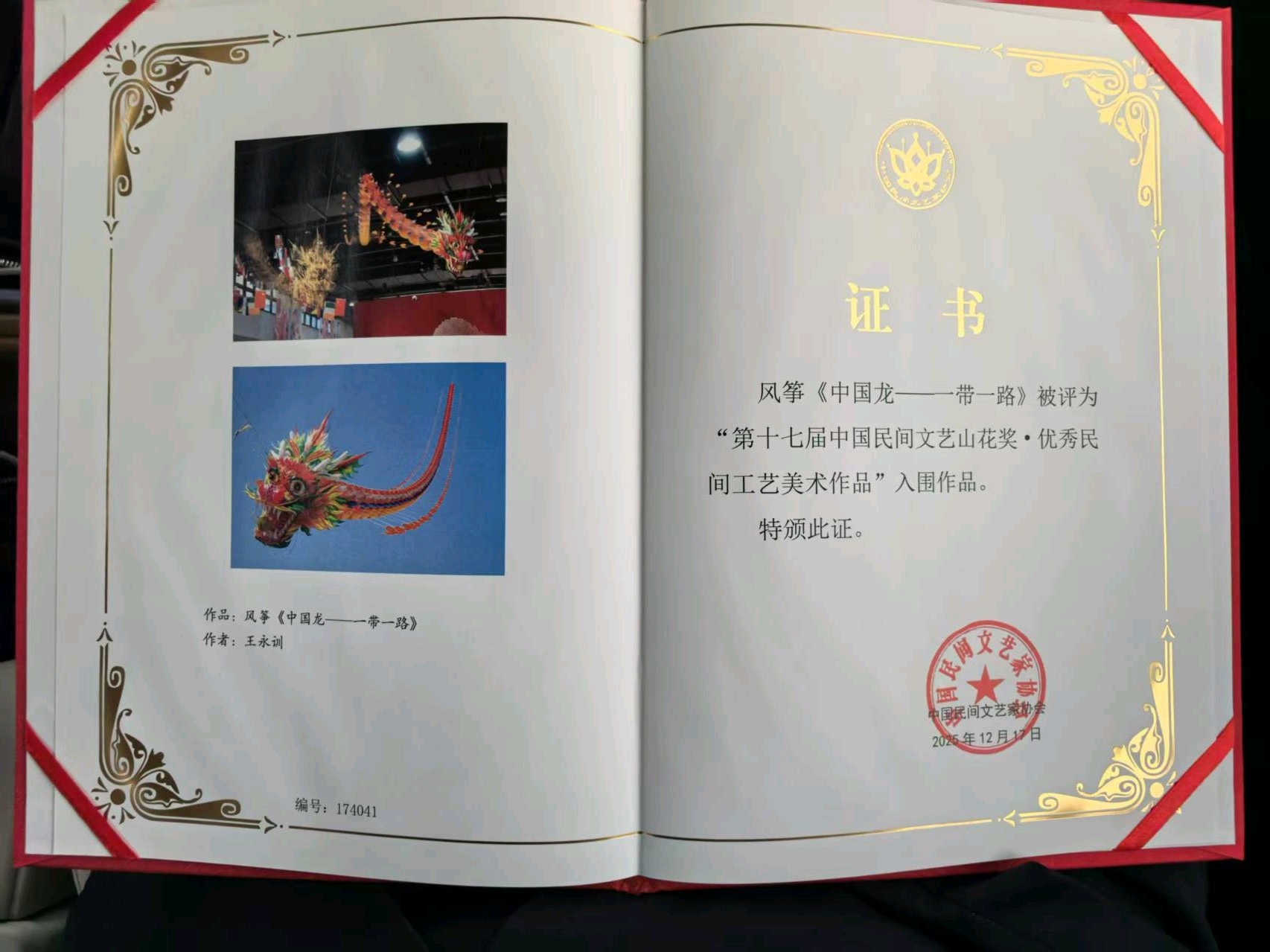 近日,第十七届中国民间文艺山花奖颁奖典礼在苏州落下帷幕。作为全国民间文艺的最高奖项,“山花奖”历来被视为民间工艺美术创作的风向标。在本次评选中,由国家级非物质文化遗产项目潍坊风筝市级代表性传承人、山东省民间艺术大师王永训创作的风筝作品《中国龙——一带一路》,成功入围优秀民间工艺美术作品。潍坊市委书记刘运专门会见王永训,向其表示祝贺,并勉励他继续秉承工匠精神,传承弘扬好非遗技艺。