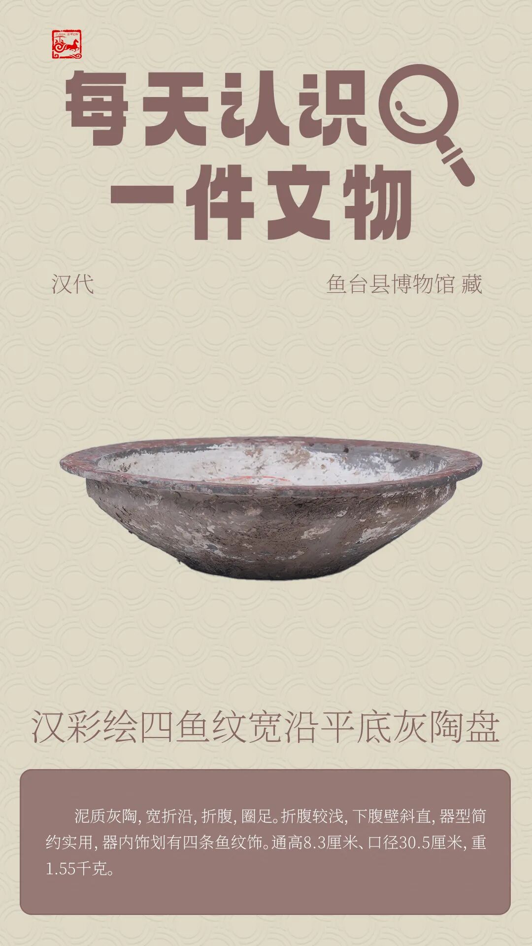 【济宁宝藏】汉彩绘四鱼纹宽沿平底灰陶盘