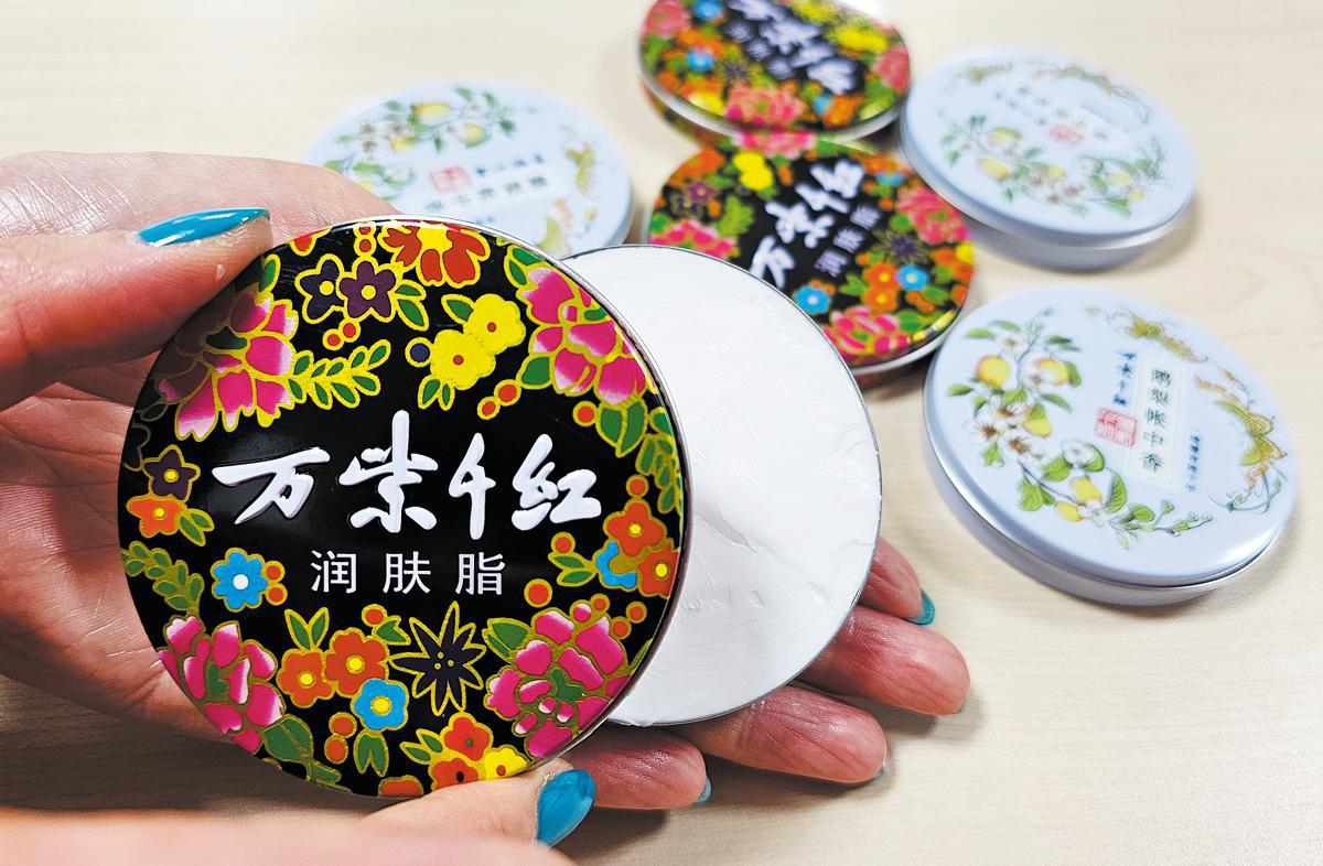 Tins of moisturizing cream from the heritage brand Wan Zi Qian Hong on display in Beijing on Thursday. GENG FEIFEI / CHINA DAILY