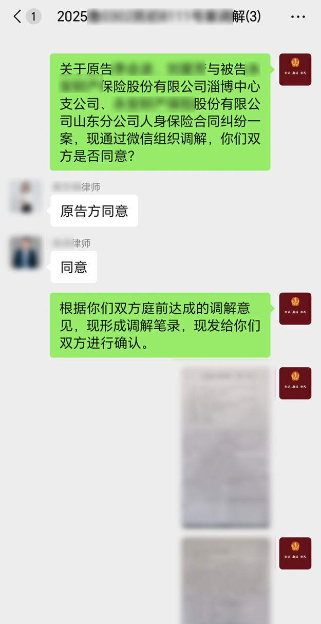 为深入践行新时代“枫桥经验”,持续优化诉讼服务、减轻群众诉累,近日,淄博市淄川区法院太河法庭立足群众需求,以“先开庭理清事实、后线上降低诉累”的办案思路,成功调解一起人身保险合同纠纷。法庭通过两次线下开庭固定证据、明确争议焦点,再依托微信平台远程协商,成功促成合解,既守住事实底线、高效化解矛盾,又大幅缩减当事人时间成本,实现了法律效果与社会效果的有机统一。