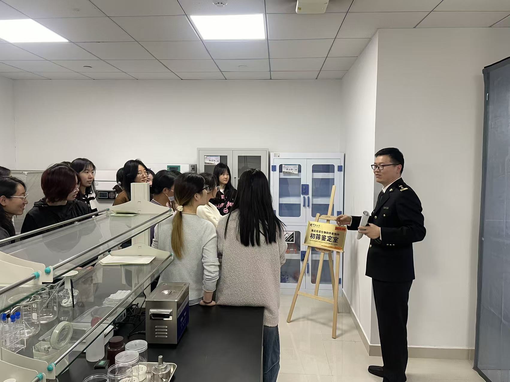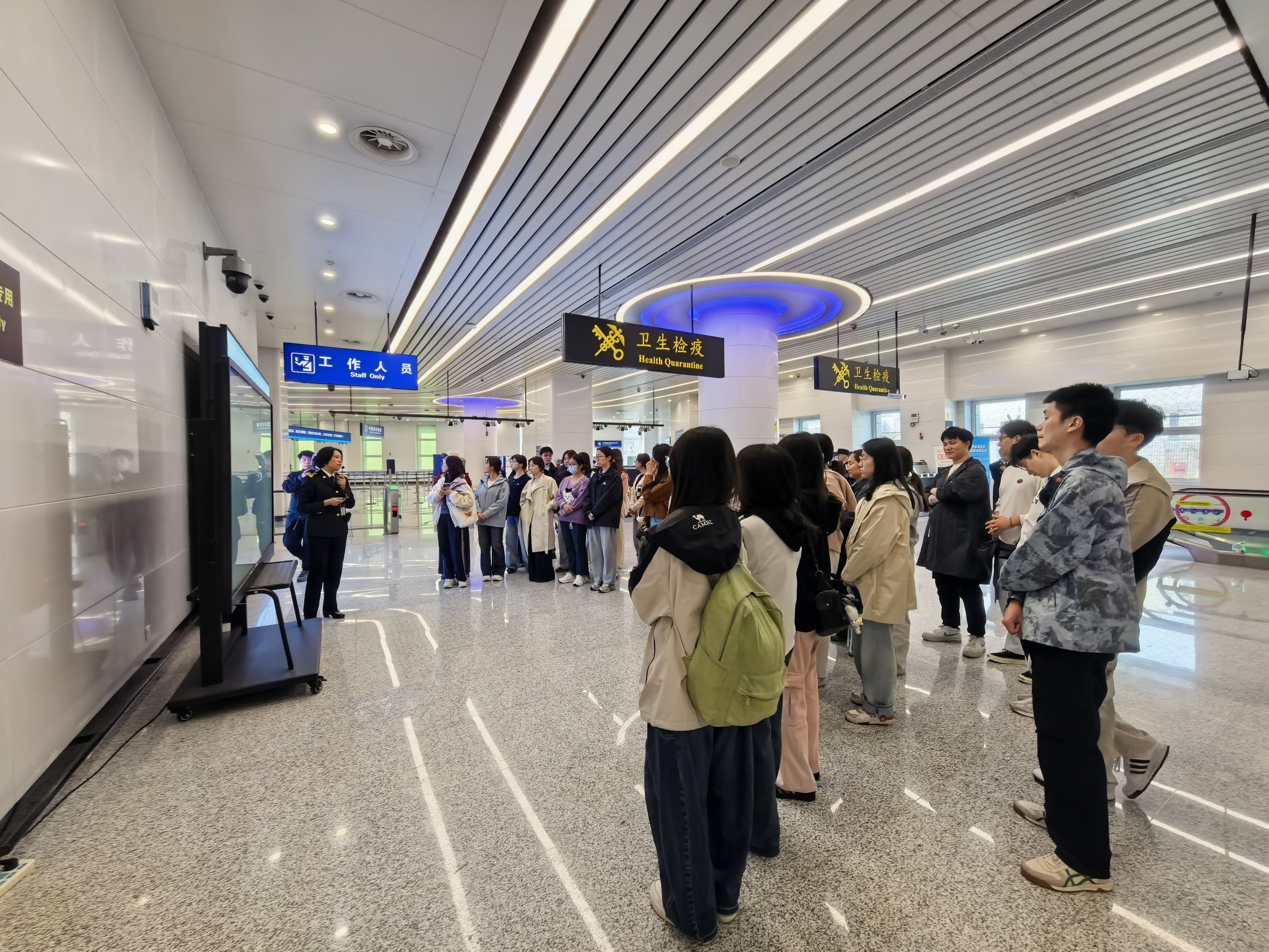 在出境卫生检疫通道,工作人员详细讲解出入境通关流程与卫生检疫要点,协助师生快速有序通过安检;在有害生物与外来物种初筛鉴定室,通过专业讲解与实物展示,介绍口岸动植物检疫工作流程,普及防范外来有害生物入侵、维护国家生态安全与生物多样性的重要意义。在卫生检疫区域,师生们实地参观健康申报核验、医学排查、采样检测等软硬件设施,现场观摩入境旅客传染病监测、医学筛查与应急处置全流程模拟演示,直观感受海关严密筑牢口岸公共卫生防线的全过程。在入境旅检监管现场,关员讲解旅客行李物品监管规定与禁限物品处置流程,展示禁限实物物品,让国家安全知识更加可感可知。