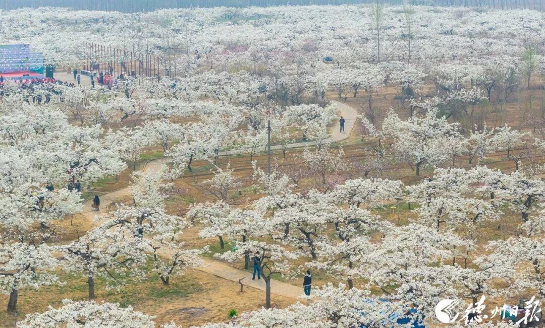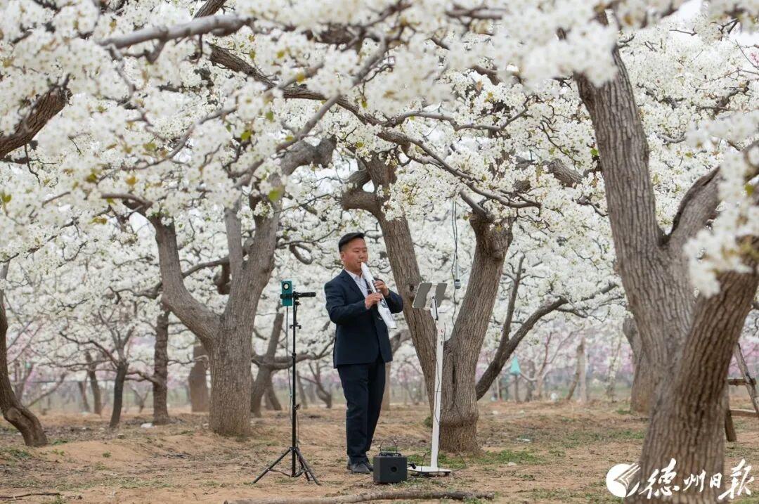在夏津香雪园千亩梨花如雪绽放游客身着古装赏花从“看景”变为“入景”解锁春日新景致