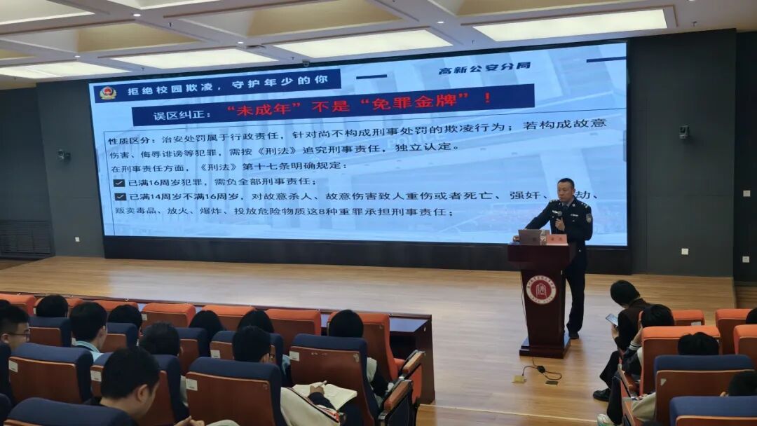 讲座中,崔浩结合初中生身心特点与校园真实场景,用通俗易懂的语言、贴近生活的讲解,围绕校园欺凌的识别、危害与应对方法,为同学们带来全面、实用的安全法治教育。