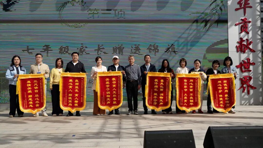初一年级家长代表上台发言。他代表全体家长,向辛勤耕耘的老师们致以诚挚谢意,并为学校送上锦旗。家长表示,将全力支持学校各项工作,积极参与校园开放月活动,与学校同心携手、助力孩子成长。