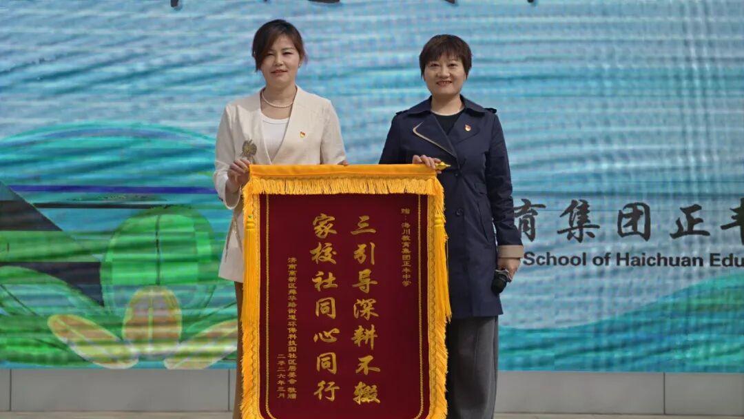 环保科技园社区书记卢传花上台致辞。她十分欣赏正丰中学在“三引导”行动中的积极响应,对校社双方携手开展的系列活动表示感谢。卢传花热情欢迎老师们、同学们、家长们走进社区、参与社区活动,期待与学校进一步深化合作、资源共享,共同搭建更紧密、更高效的校家社协同育人平台。随后,卢传花代表社区向学校赠送锦旗,传递校社同心、共育未来的美好愿景。