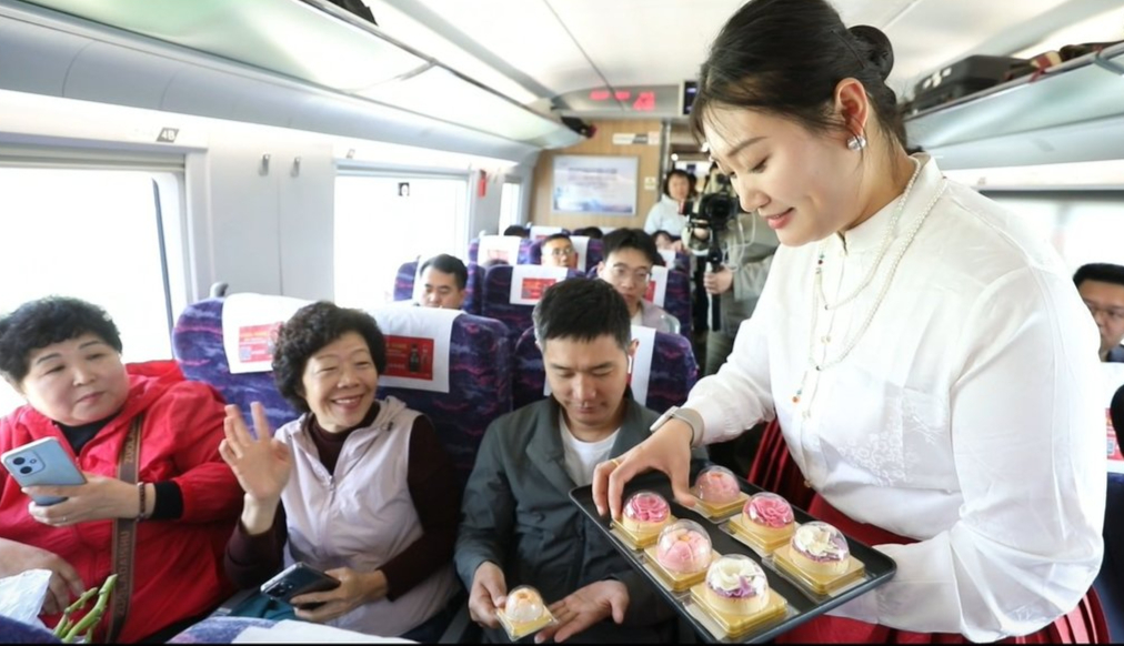列车首发日,以“乘高铁・赏国色・游菏泽”为主题,打造了沉浸式牡丹文化出行体验。走进G2097次列车车厢,精美的牡丹窗花映着春日阳光,雅致的牡丹插花点缀在车厢各处,处处洋溢着浓郁的牡丹文化氛围。餐吧升级为“牡丹主题餐吧”,供应牡丹鲜花饼、牡丹花蕊茶等特色美食茶饮;车内设置文化互动环节,由专人讲解菏泽牡丹历史、品种及节会亮点,邀请民间艺人现场展示牡丹剪纸、曹州面塑等国家级非遗技艺,并为旅客赠送牡丹文创产品,让旅客在旅途中就能提前感受菏泽牡丹的独特魅力。