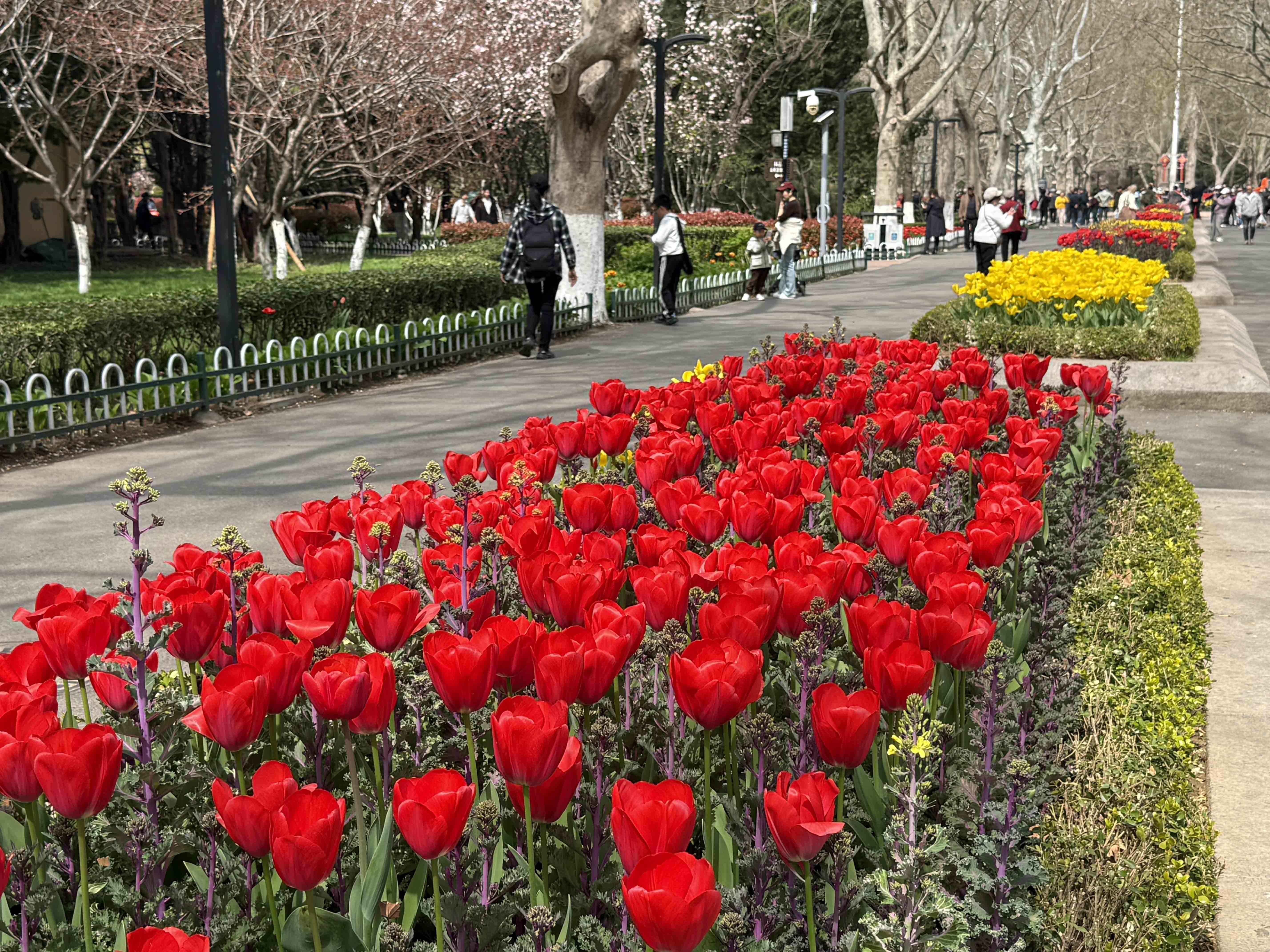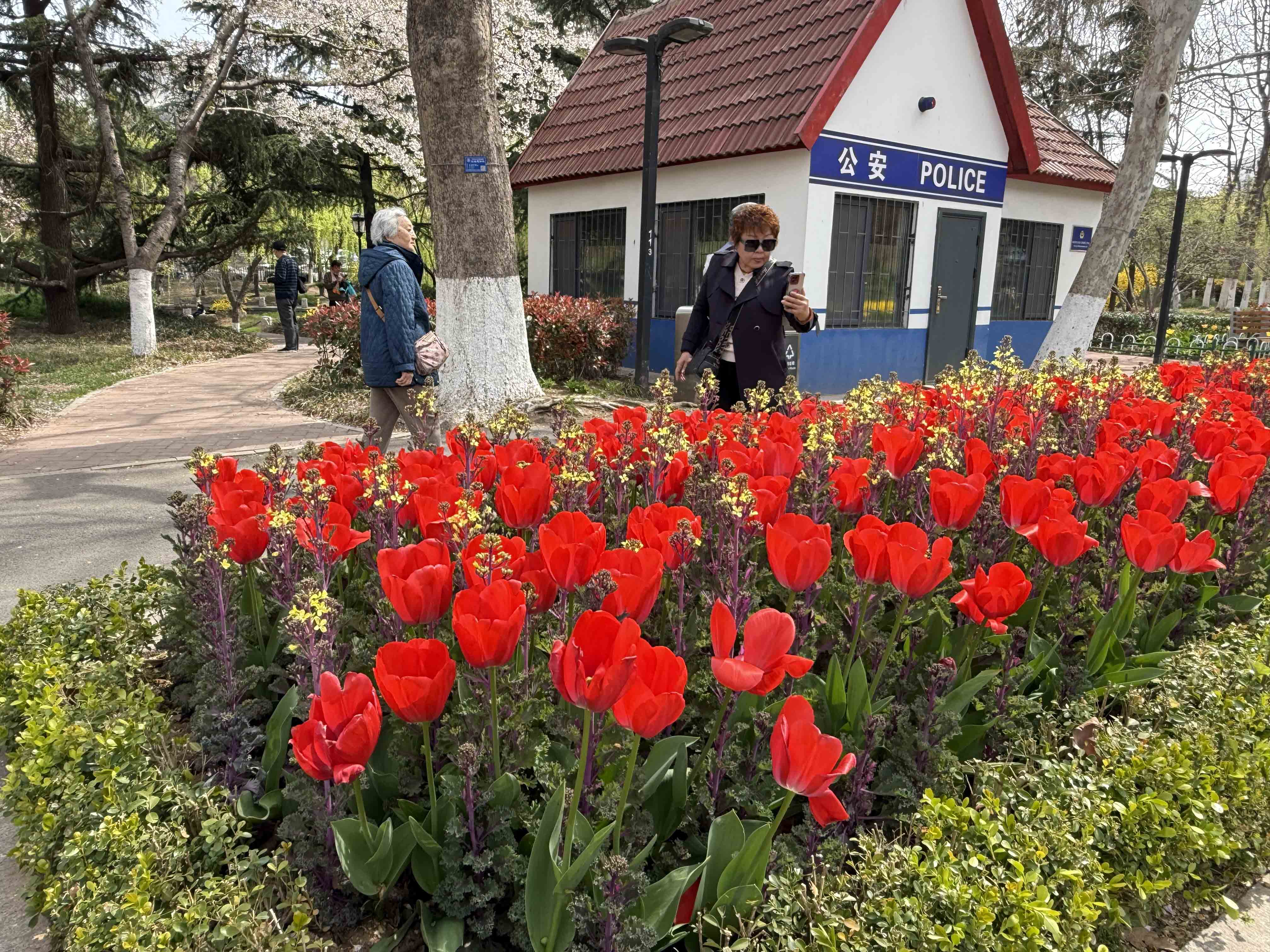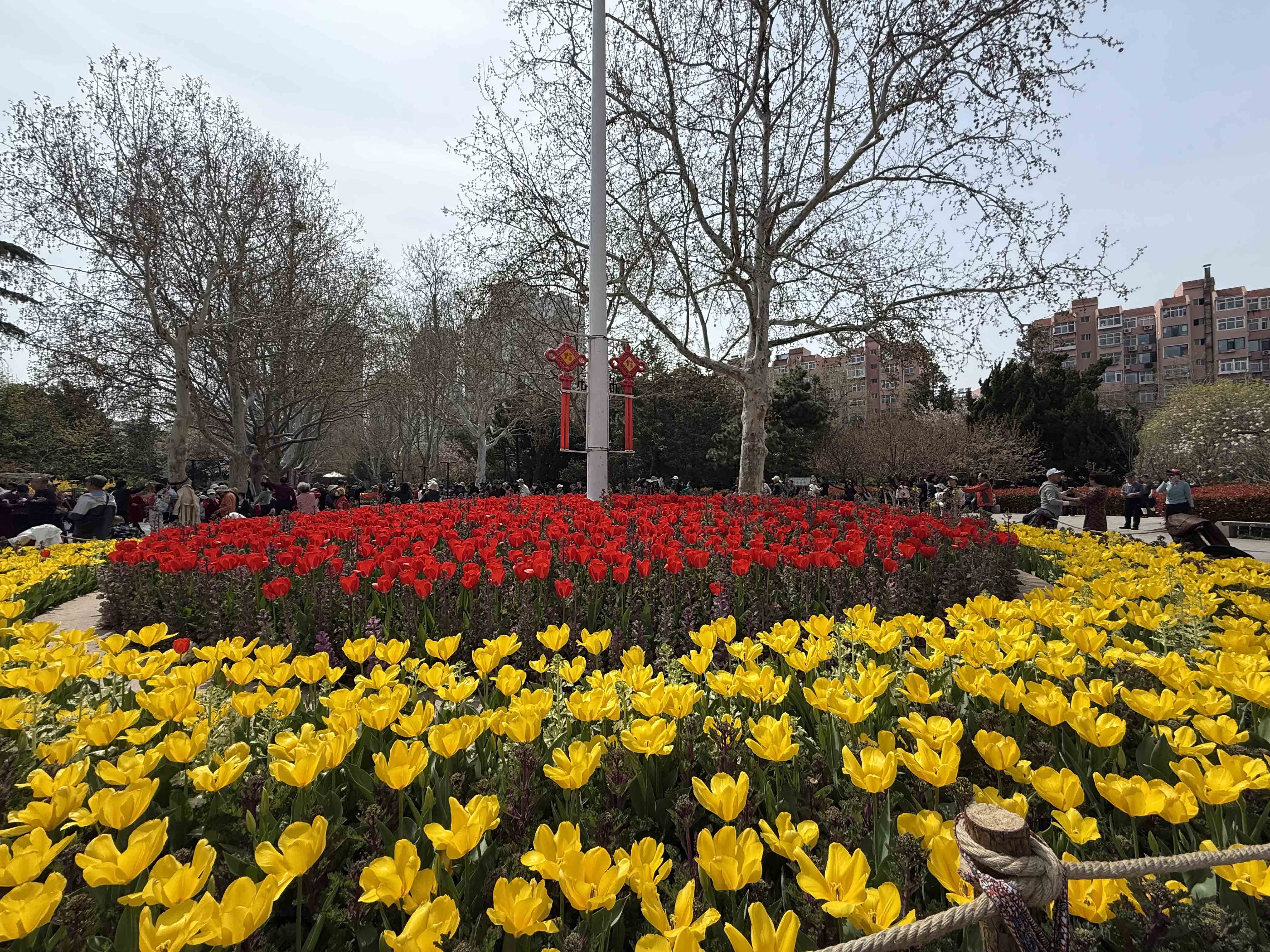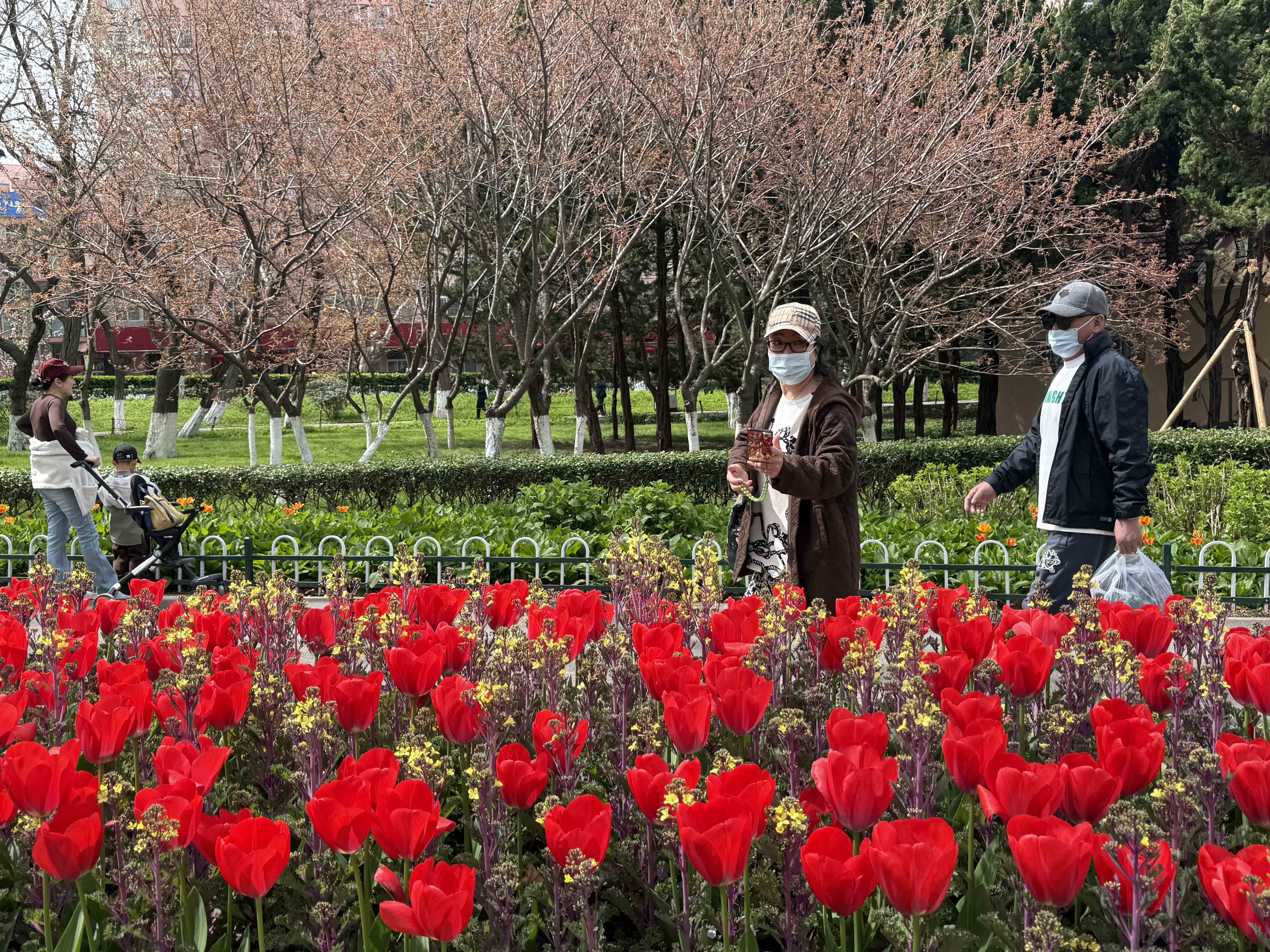 4月11日,青岛海泊河公园里,郁金香次第绽放,缤纷艳丽、生机盎然,吸引市民、游客前来赏花观光。(大众新闻·大众日报记者薄克国)