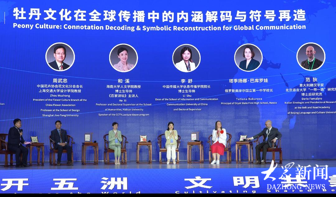 全国青联常委、文化艺术界别副秘书长荣宏君,上海交通大学创新设计中心主任周武忠,海南大学人文学院教授和溪,中国传媒大学信息传播学院院长李舒,青年汉学家,四川外国语大学意大利籍专家范狄,俄罗斯奥廖尔市国立第一中学校长塔季扬娜·巴库罗娃等嘉宾,围绕“牡丹文化在全球传播中的内涵解码与符号再造”开展圆桌讨论。