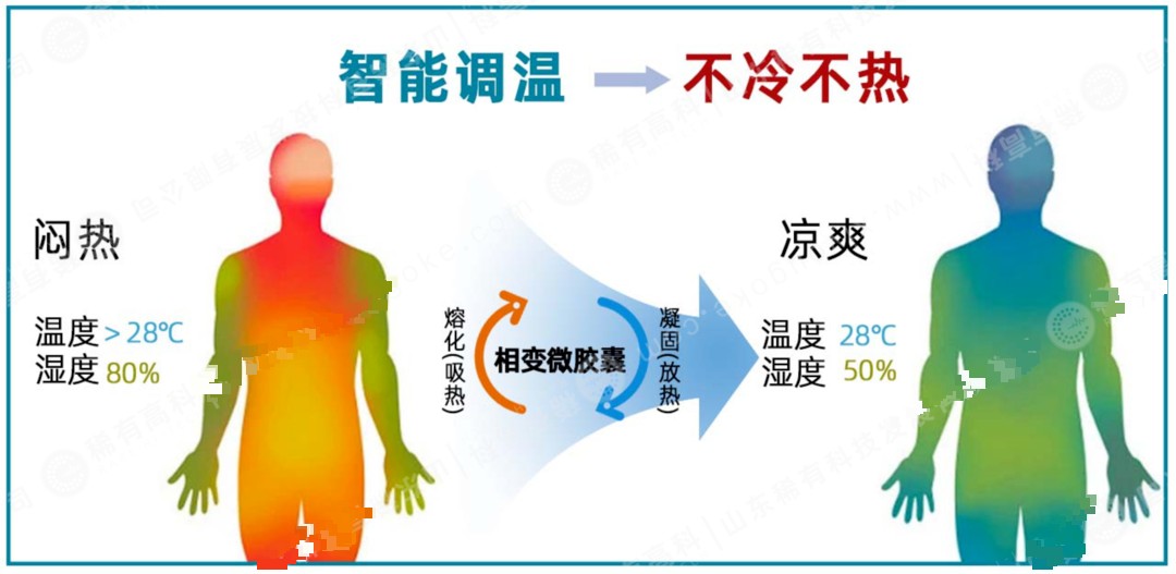 这种物质最神奇的地方,就是会跟着温度“变形态”,温度就是它的天然开关。夏天太阳暴晒,我们身体发热、体表温度升高时,它就像冰块融化一样,从固态悄悄变成液态,这个过程会大口“吞掉”身体和外界的多余热量,瞬间给皮肤降温,彻底摆脱那种被太阳炙烤的闷热感;等走到树荫下、空调房里,环境温度降下来,它又会慢慢变回固态,把之前存起来的热量轻轻释放出来,不会让我们突然觉得冷,全程无声无息,却能让身体一直处在舒服的温度区间。
