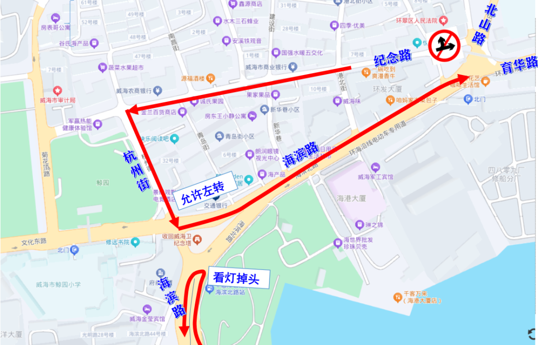 调整后,早晚高峰期间,纪念路进入育华路的车辆,可通过杭州街—文化路路口左转后经海滨路进入育华路。