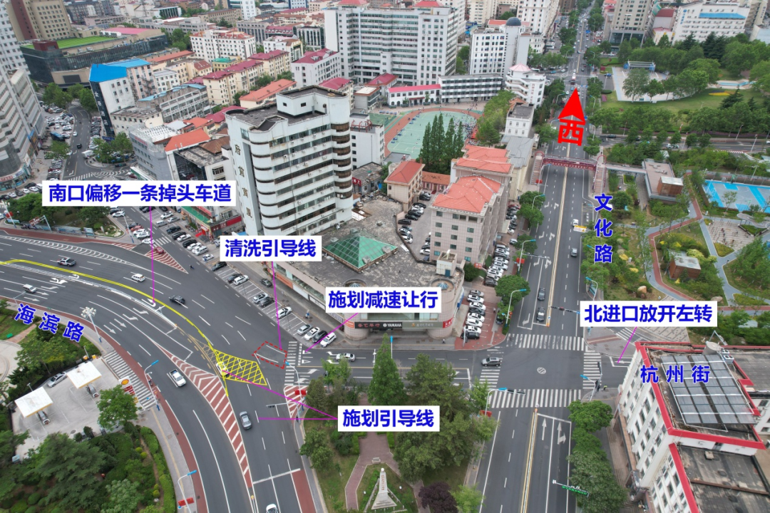 (三)周边路口渠化调整。放开文化路—杭州街北口左转,内侧车道由直行调整为直行左转,为原纪念路—北山路西口直行去往育华路的车辆绕行提供条件;海滨路—杭州街南侧增设掉头车道,掉头车辆看灯通行,减少海滨路实验中学路口掉头车流干扰。