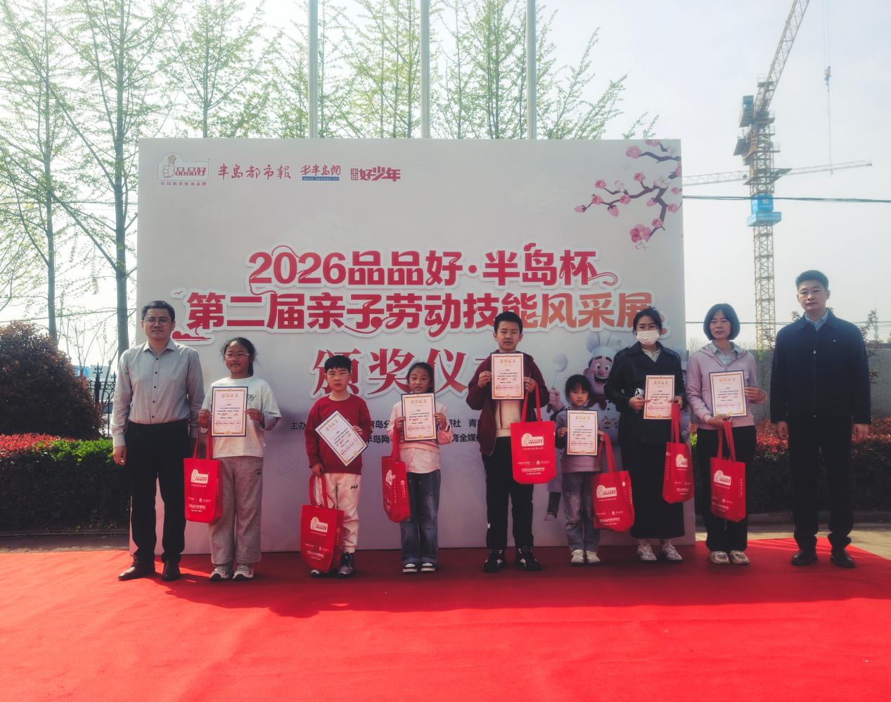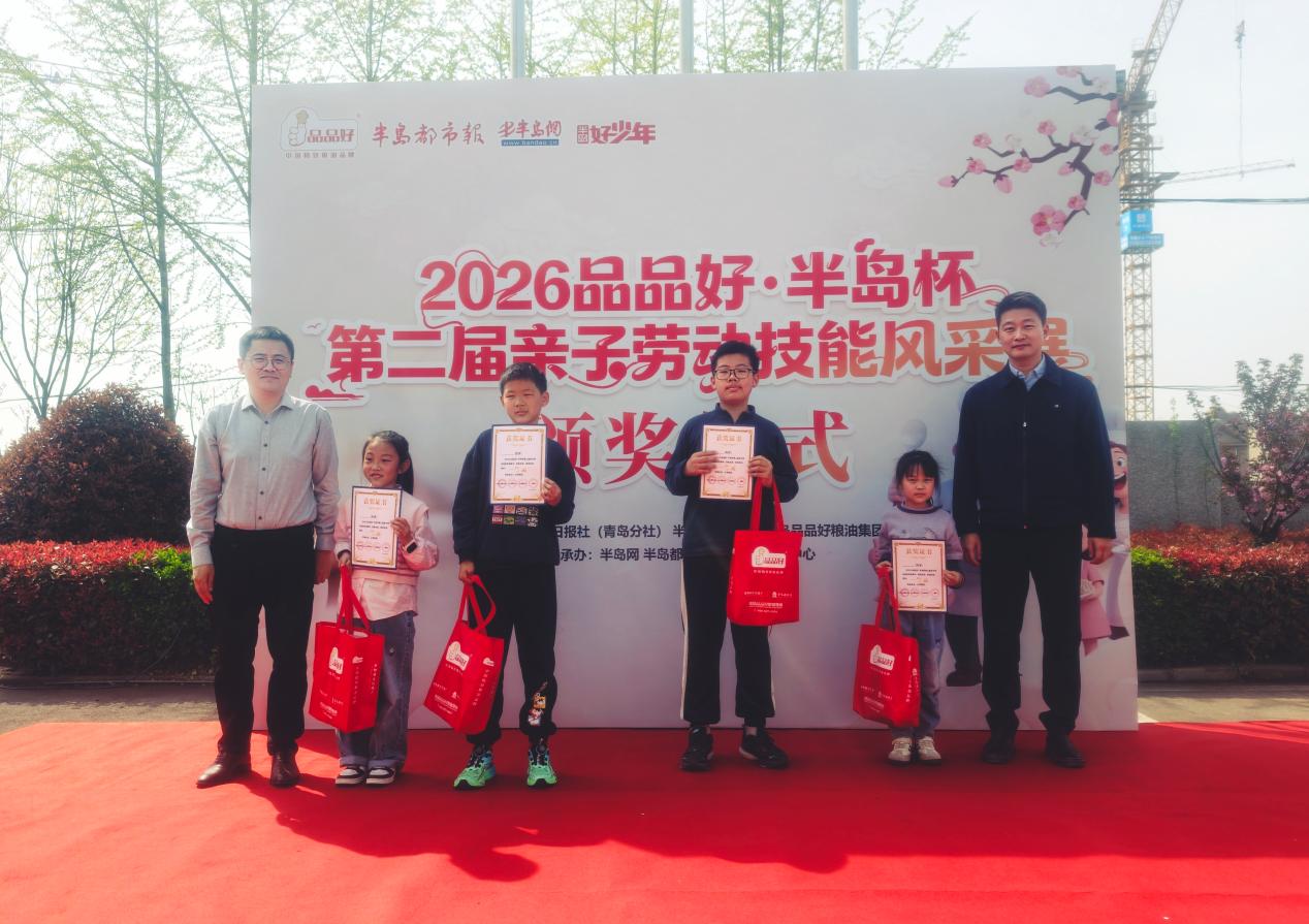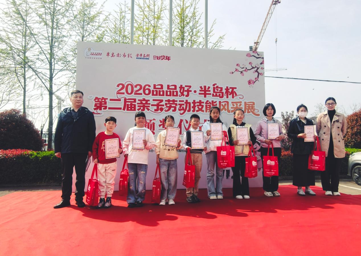 4月11日上午,2026品品好·半岛杯第二届亲子劳动技能风采展颁奖仪式在品品好粮油集团举行。获奖小选手与家长欢聚一堂,共同见证这场荣誉时刻。本次活动以“亲子厨艺秀,劳动贺新春”为主题,自寒假启动以来,吸引了岛城众多中小学生热情参与。孩子们走进厨房,从包饺子、捏花样馒头、烹制家常菜,到创意烘焙,在一次次动手尝试中从生疏到熟练,让厨房变成了最有乐趣的成长课堂。