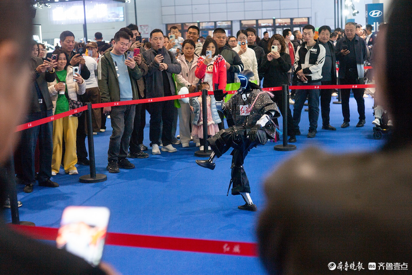 4月9日,山东国际会展中心,2026齐鲁春季车展(第53届齐鲁汽车展览交易会)一汽红旗展台,造型前卫的智能机器人进行功夫表演,吸引众多参观者驻足拍摄。王剑摄