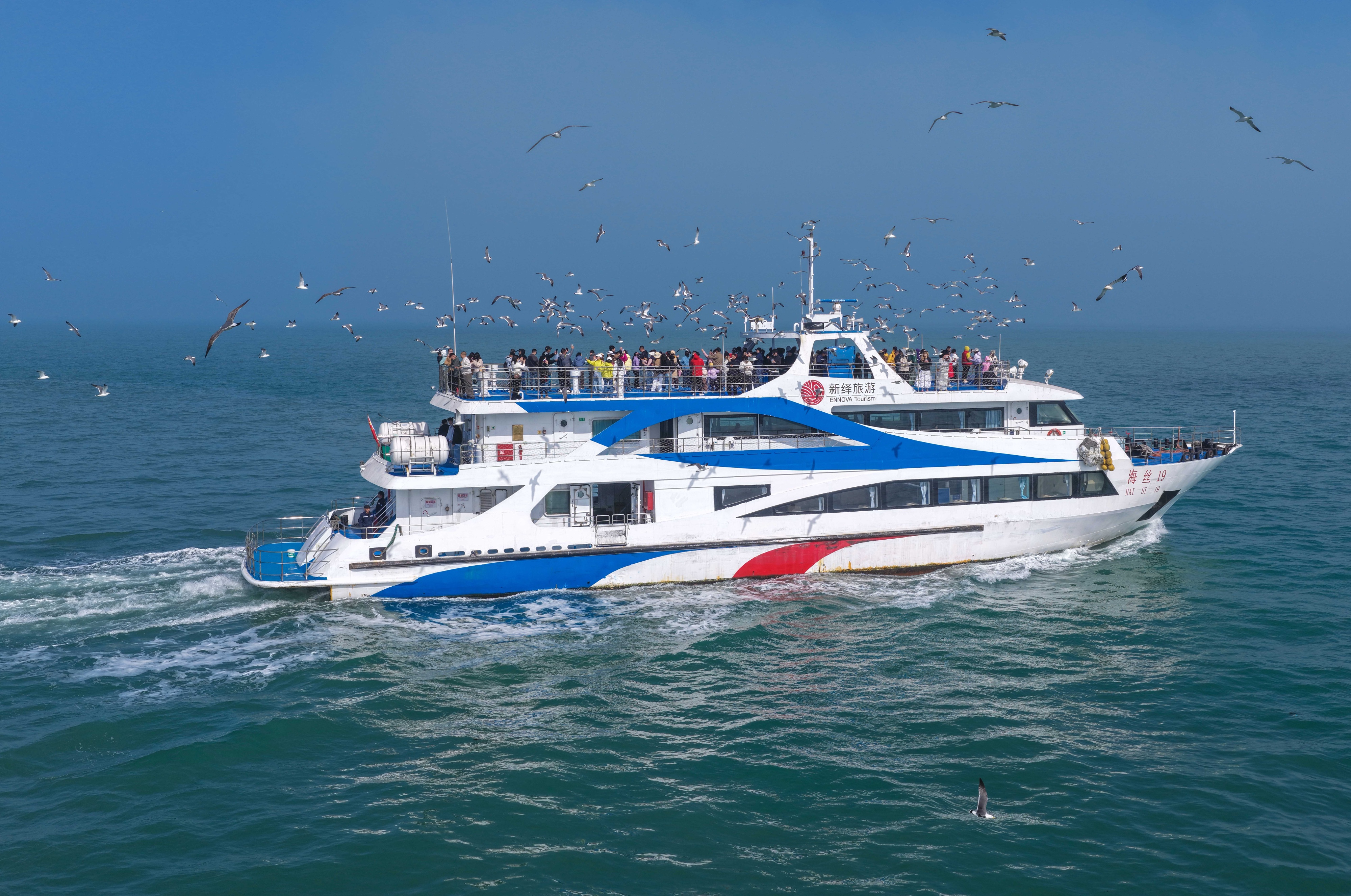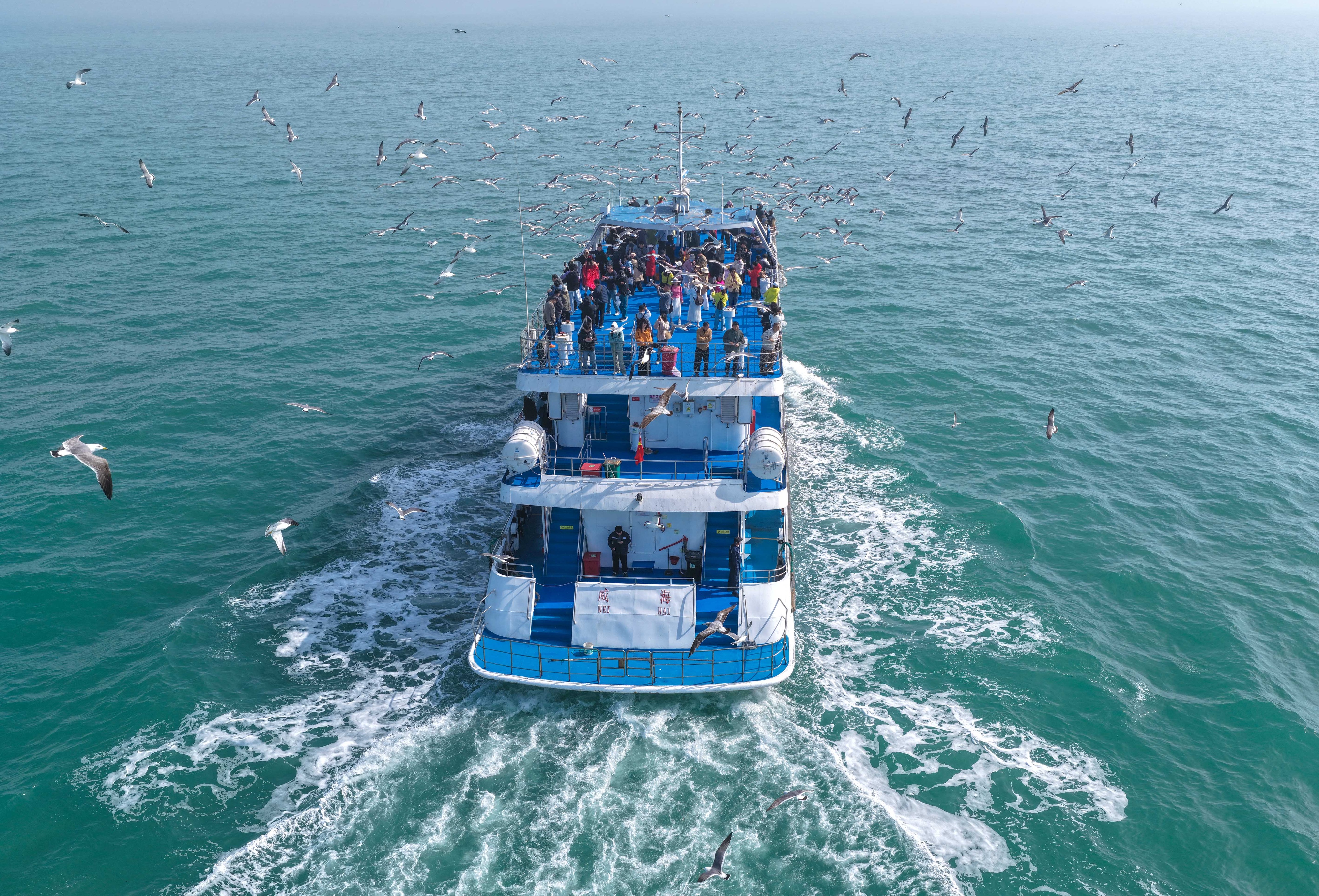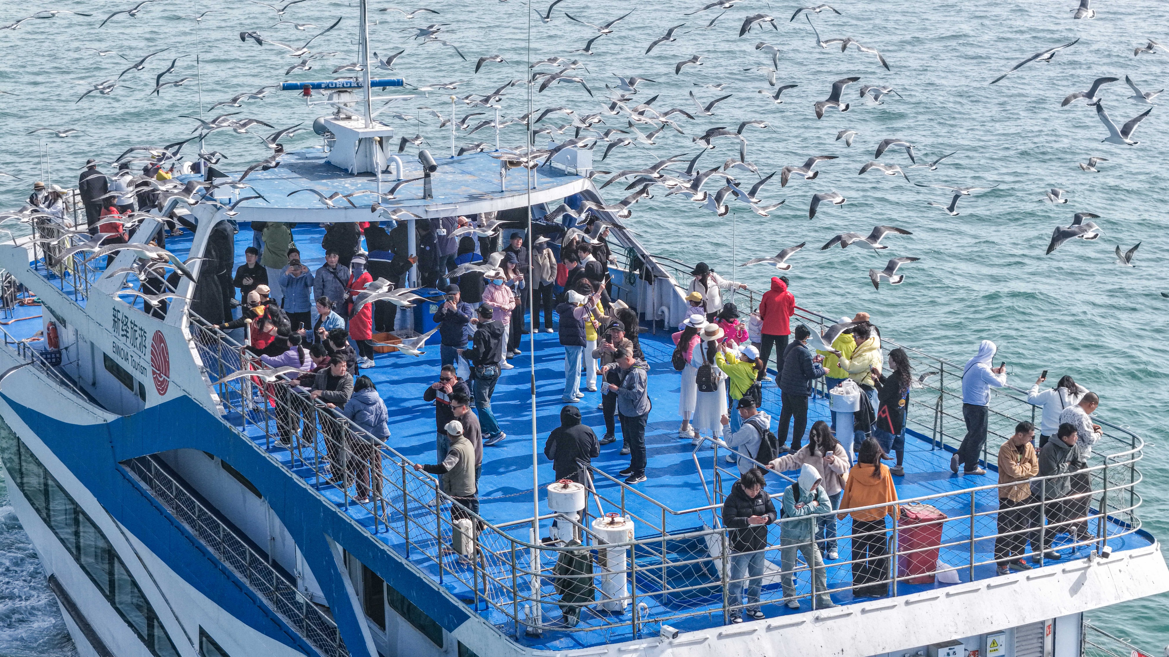 4月11日,在荣成市海驴岛海域一艘游船,游客与黑尾鸥互动,在碧海蓝天间感受生物多样性之美。成群的黑尾鸥盘旋飞舞,与游客热情互动,为春日滨海之旅增添了无限乐趣。荣成素有“中国黑尾鸥之乡”的美誉,每年3月至8月中旬,数万只黑尾鸥会来到海驴岛及周边岛屿筑巢、产卵、繁衍生息。(大众新闻记者陶相银通讯员李信君丛文考)