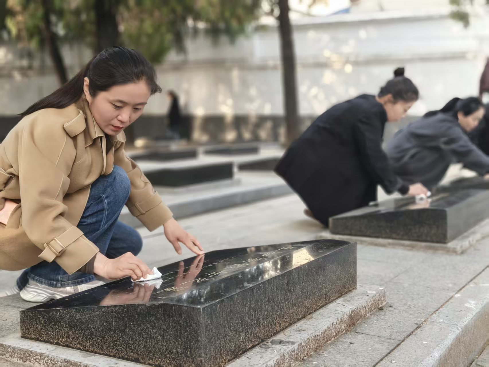 默哀仪式结束后,社区工作人员手持清洁工具,轻轻擦拭每一块烈士墓碑,细心拂去碑身的尘土,用质朴的行动守护先烈们的安息之地,让烈士墓碑洁净如初。在擦拭墓碑的过程中,大家凝视着碑上的名字与事迹,仿佛置身于那段烽火连天的岁月,深刻感悟革命先烈坚定的理想信念与舍生取义的伟大精神,接受了一场深刻的红色教育与精神洗礼。