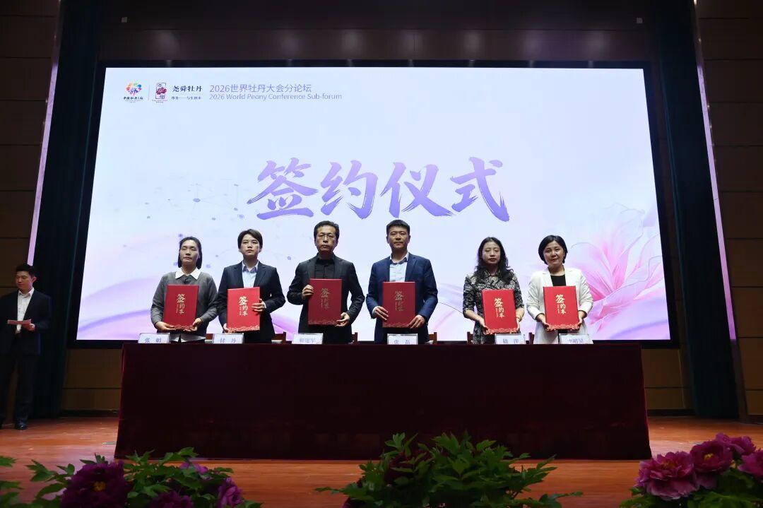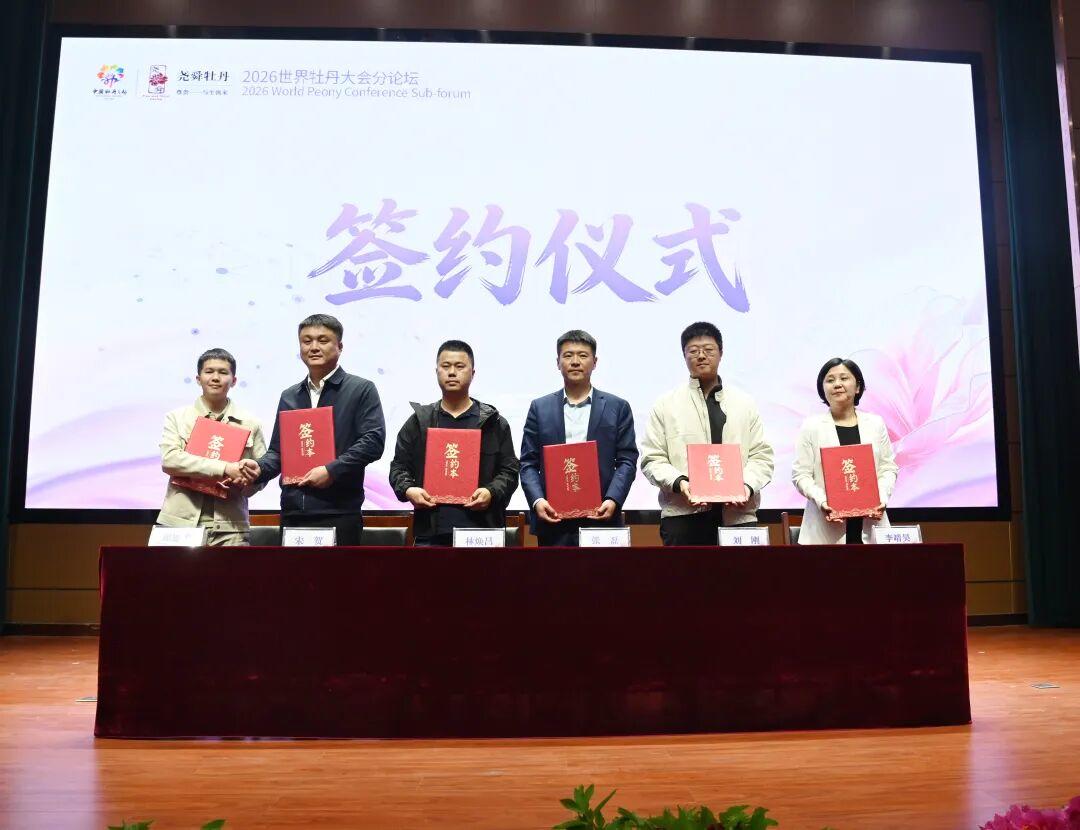 签约环节,菏泽尧舜牡丹生物科技有限公司分别与梦享珈生物科技(上海)有限公司、广州宇峰化工有限公司、蓝宇创科(广州)生物科技有限公司、东道品牌创意集团有限公司、杭州品冠群芳文化旅游发展有限公司等多家企业达成战略合作,涵盖原料供应、品牌设计、渠道拓展等领域,以资源互补、互利共赢推动牡丹产业规模化、规范化发展。