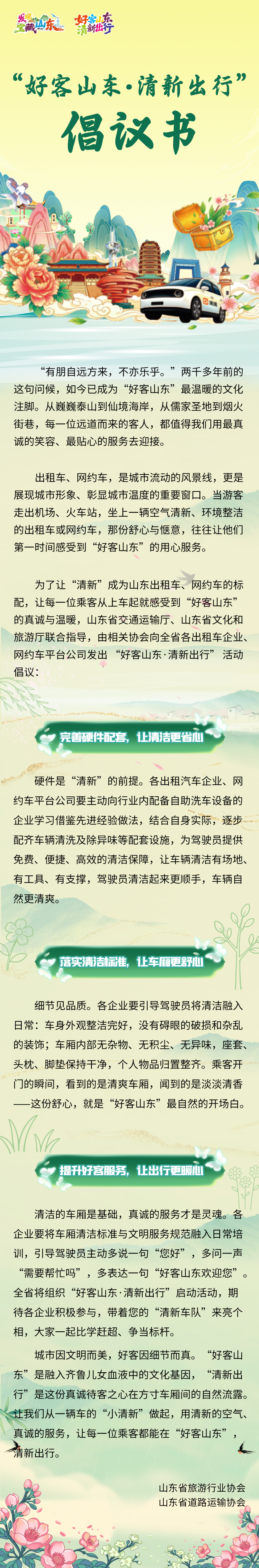 出门打辆车,最能读懂一座城的温度;小小的车厢里,藏着山东最质朴的待客之道。眼下,“好客山东·清新出行”行动将陆续在全省全面铺开,从老百姓天天接触的出租车、网约车入手,将“好客山东”文旅品牌,落到车厢整洁、服务贴心这些小事上,让“好客”变成看得见、摸得着的真实体验。