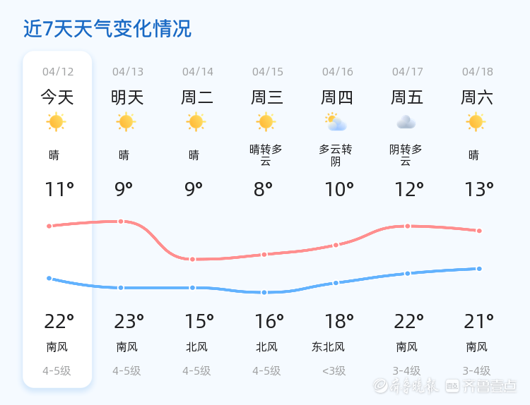 今天是4月12日,星期日,农历二月廿五。威海市迎来晴朗天气,全市各区气温在11℃到22℃之间,西南风4级,空气湿度46%,PM2.5指数58,空气质量良好。市民们可以趁着好天气外出活动,享受春日阳光。