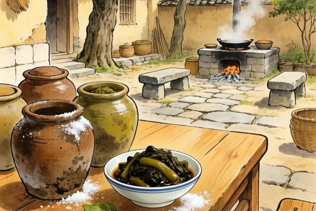 小咸菜的做法,说来简单,却考验耐心。母亲做萝卜干,先把萝卜切成手指粗细的条,摊在竹匾里,放在屋檐下暴晒。秋日的阳光不烈,要连着晒上三五天。萝卜条渐渐失了水分,原本硬挺的变得柔韧,拿在手里弯而不折。这时母亲烧一大锅盐水,放凉了,把萝卜条泡进去,加辣椒面、花椒粉、八角拌匀,再一层层码进坛子里,最后压上一块洗净的河石,封好坛口。剩下的,就交给时间。那坛萝卜干静静地立在墙角,谁也不知道里面发生着怎样微妙的变化。盐豆更费工夫。黄豆煮熟,裹上面粉,盖上纱布,等它长出细细的白毛,那是霉菌在辛勤工作。母亲每天要看好几次,说温度太高了不行,太低了又发不起来。等白毛长到一寸来长,才拌上盐、姜丝、花椒水,再密封起来。过些日子打开,豆子已变成酱色,用筷子挑一点放进嘴里,先是咸,接着是鲜,最后有一丝丝回甘。这让我想起《齐民要术》记载的“作豉法”,贾思勰详细记录了古人制豆豉的工序,从淘豆、蒸煮到发酵、调味,一丝不苟。一千多年前的中国人,就是这样用耐心和时间,把普通的黄豆变成餐桌上的至味。