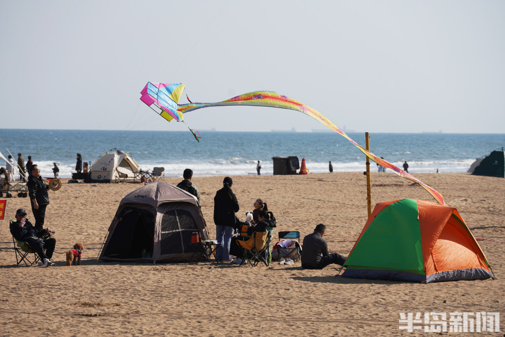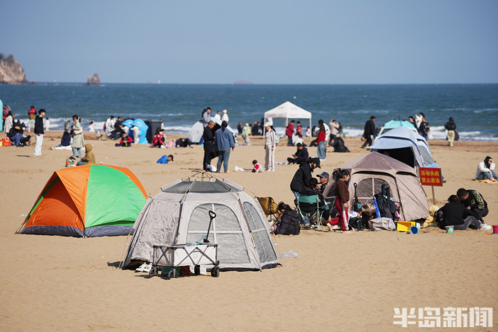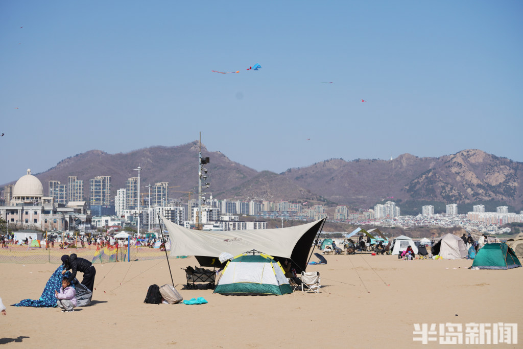 4月12日,岛城阳光明媚,沿海一线碧海蓝天,吸引了不少市民和游客前来游玩。在石老人海水浴场,大家聚集在沙滩上,扎起五颜六色的帐篷,享受着周末的快乐时光。(半岛全媒体记者宋泓睿)