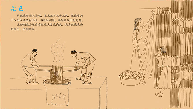 艾德莱斯意为“扎染”,讲究先染后织,图案融合地域特色,种类丰富,常见石榴纹、巴旦木纹、手鼓纹、羊角纹等。图画书在故事的后半部分特意附上了“艾德莱斯绸大揭秘”,这部分以铅笔速写的艺术线条,将选茧、缫丝、纺线、图案、扎经、染色、分线、纺织等抽象的非遗知识形象化,牵引着孩子们步入这座瑰丽的非遗殿堂。