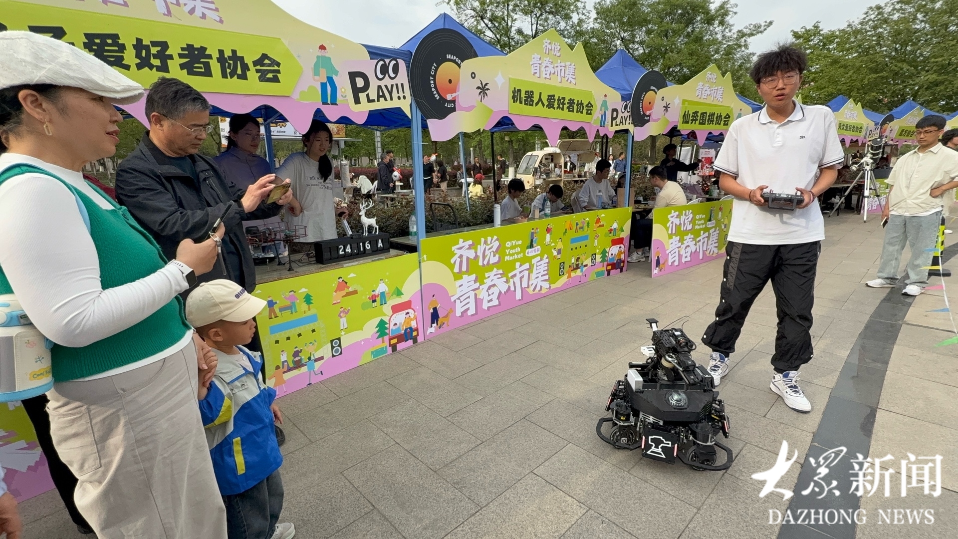 作为“百万大学生进社区”的生动实践,山东理工大学16个社团、110名大学生组团入驻市集,成为现场最亮眼的风景线。在机器人爱好者协会的展位前,机械工程学院大二学生、协会副会长吴沁峰正手持遥控器,操控着团队自主研发的机甲大师哨兵单位机器人战士,与市民热情互动。这款由学生们联合研发、斩获国家级A类赛事全国二等奖的机器人,机身线条硬朗、科技感十足,灵活的移动与精准的动作演示,引得围观市民阵阵惊叹,不少家长带着孩子驻足围观、近距离体验,沉浸式感受科创魅力。