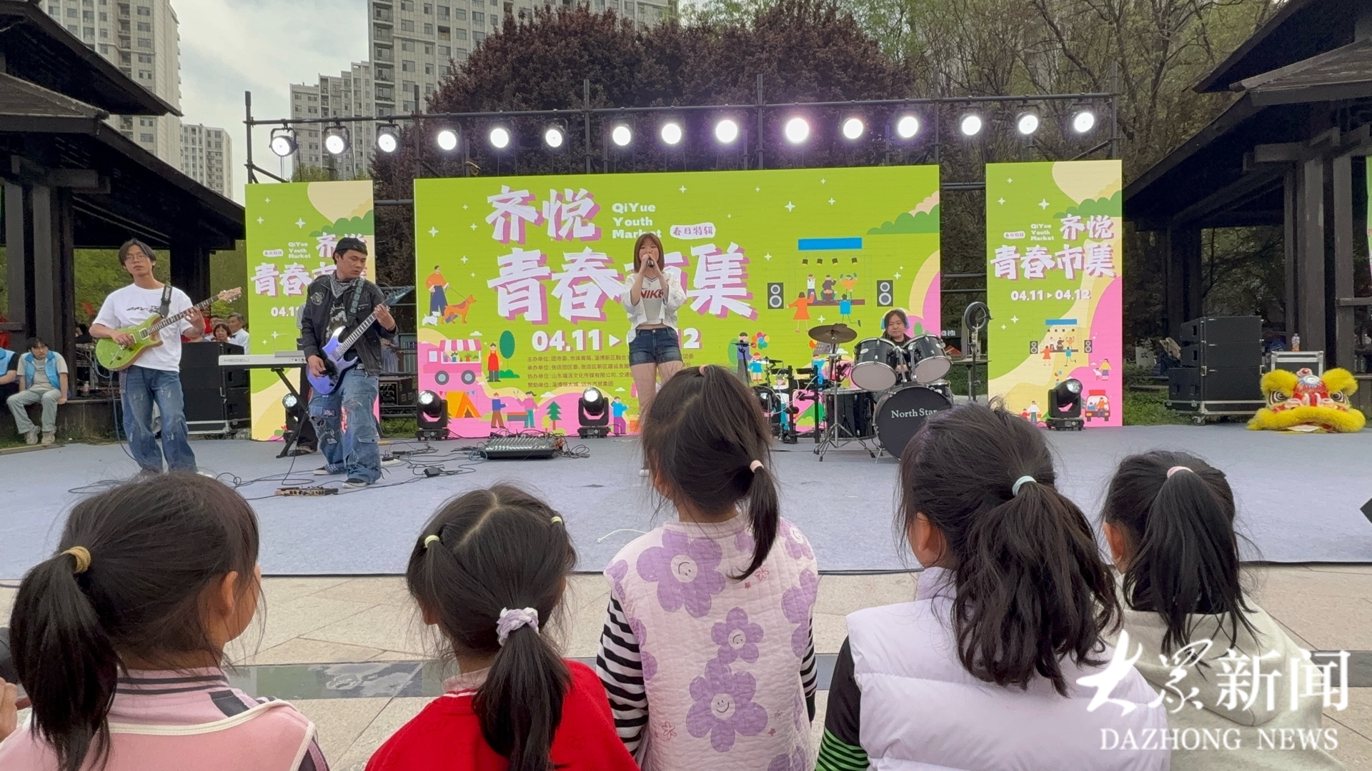 春日湖畔,微风拂面,市集现场人头攒动、热闹非凡。色彩明快的“齐悦青春市集”主题摊位整齐排布,蓝粉相间的遮阳棚下,创意摊位与特色展演相映成趣,灯光与湖光交相辉映,歌声与笑语交织共鸣,处处洋溢着青春的朝气与活力。市集融合青年文化、社区互动与夜间经济,精心设置舞台演艺区、大学生市集区、后备箱集市区、潮汐摊位、交友相亲角、社区团购区等多元板块,打造集观赏、体验、消费于一体的沉浸式青春主题场景。舞台演艺区汇聚山东理工大学大学生艺术团、克莱因乐队等青年音乐力量,两日共编排55个精彩节目,乐队Live、魔术互动、舞蹈串烧等多元形式轮番上演,让动感旋律与市集烟火气碰撞出别样火花。