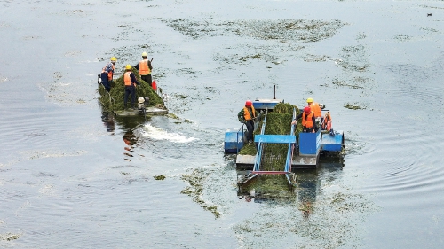 腊山分洪道水草“疯长”,打捞船河面清捞