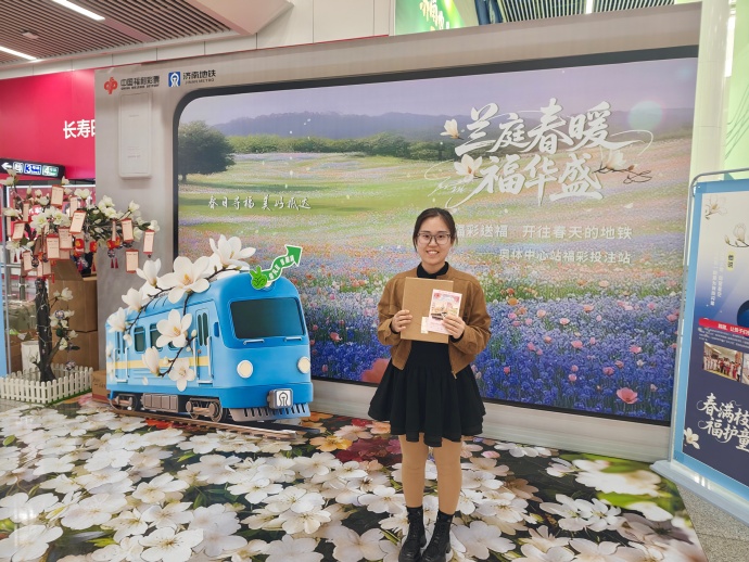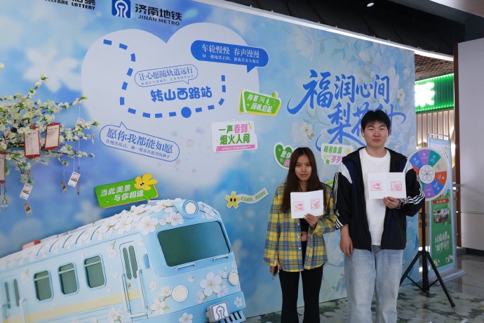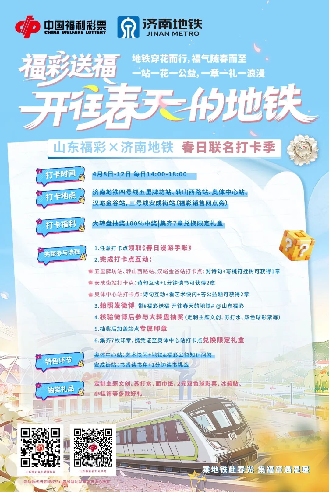 4月8日-4月12日,每天14:00-18:00,山东福彩联名济南地铁,在5个站点打造“春日寻福驿站”。领一本手账、对一句春诗、挂一枚桃符、盖一枚联名印章……