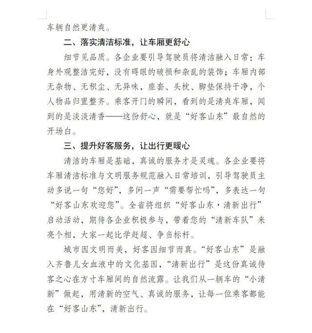 自“清新行动”开展以来,济南市交通运输局通过一系列务实举措,交出了一份亮眼的成绩单:12345热线工单量同比下降近四成,网约车双合规订单率位居全省第一、全国前列。市交通运输局表示,下一步将按照《山东省出租车(网约车)“好客山东·清新出行”专项提升行动实施方案》有关要求,聚焦车容车貌等问题,以“清新出行”小切口行动,进一步加大治理力度,关心关爱司机群体,持续提升乘客出行满意度和幸福感。