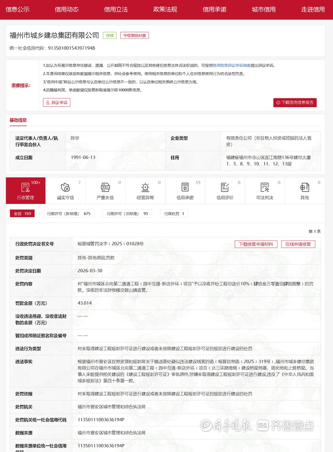 3月30日,信用中国公布了对福州市城乡建总集团有限公司行政处罚决定。