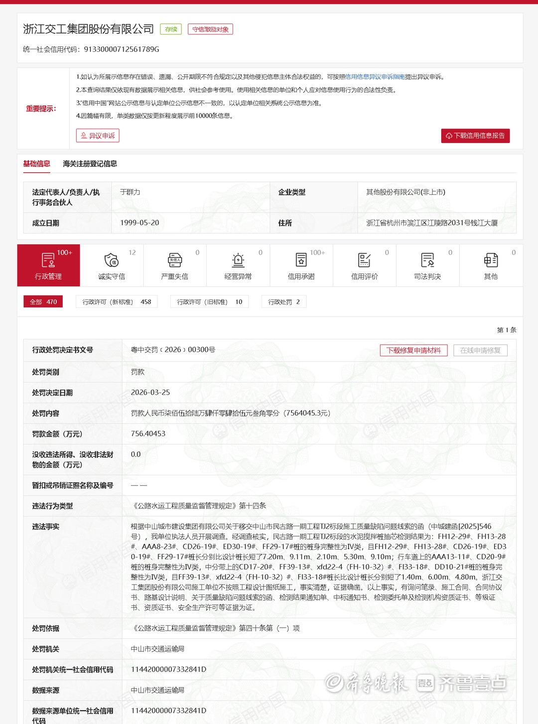 3月25日,信用中国公布了关于浙江交工集团股份有限公司(下称“浙江交工”)的行政处罚决定。浙江交工因施工单位不按照工程设计图纸施工,被中山市交通运输局罚款756.40453万元。