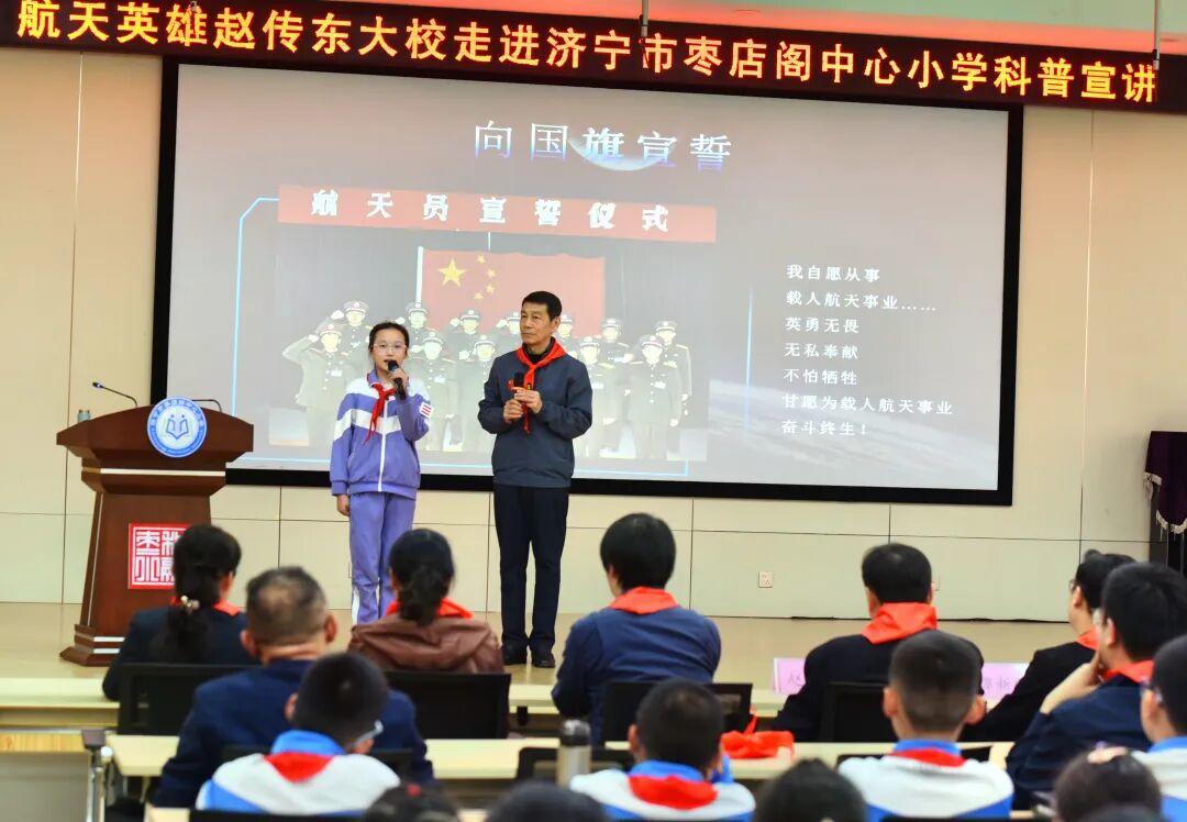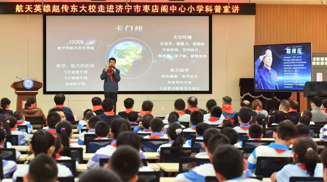 在第十一个“中国航天日”来临之际,济宁市枣店阁中心小学举办“航天筑梦·强国有我——我与航天英雄面对面”航天科普进校园主题活动。中国首批航天员、航天科普专家赵传东大校走进课堂,与数百名师生面对面,开启了一场叩开“飞天梦”的奇妙课堂。