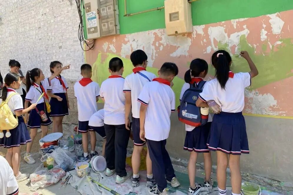 “舍得一人脏,换来万家净”——这是学校校外辅导员、山东省劳动模范陈国瑞的名言。2024年夏天,苏锦熙参加了陈国瑞挂职的商河杨八士村组织的“绘百面劳模墙”活动。时值盛夏,天气热得让人透不过气,她克服闷热流汗、腿脚发酸的疲劳,不断鼓励并照顾身边的小伙伴,一起加油,最终完成了整幅作品,受到村民好评,陈国瑞叔叔也夸奖她是能打硬仗的好少先队员。