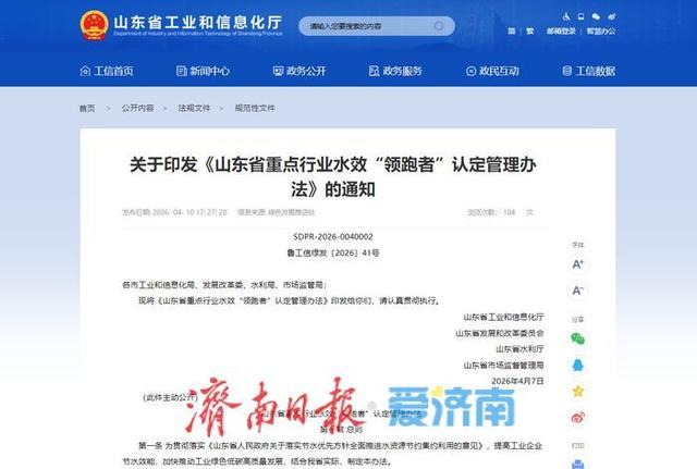 近日,省工业和信息化厅、省发展改革委、省水利厅、省市场监管局联合印发《山东省重点行业水效“领跑者”认定管理办法》,该办法将于2026年5月8日起施行,有效期三年。办法明确,每年认定一批水效“领跑者”企业,通过标杆引领推动工业节水增效,为山东水资源节约集约利用再添制度保障。