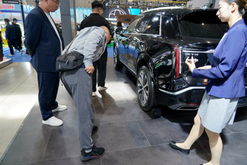 4月11日上午,一位阿姨在车旁徘徊,伸手摸摸车门,看看里面内饰。见记者走近,她下意识往旁边让了让,眼神里带着几分不好意思。看到记者胸前的媒体证,她赶紧摆手:“我就是随便看看,没啥好采访的。”
