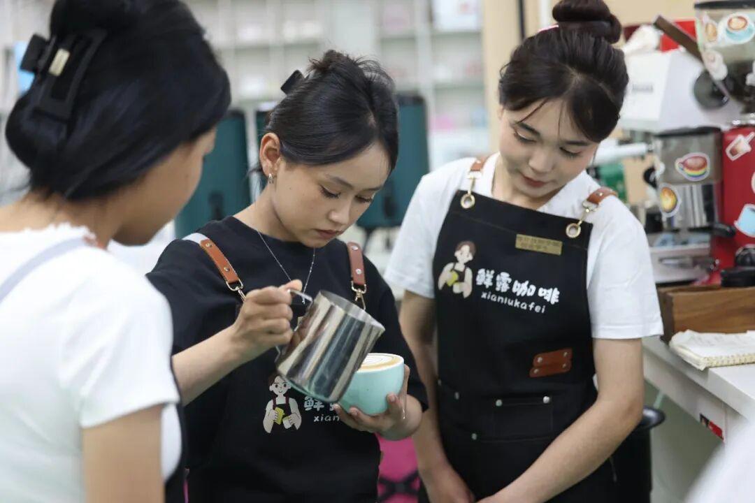 学生正在练习咖啡拉花。喀什地区融媒体中心 记者陈文军 摄