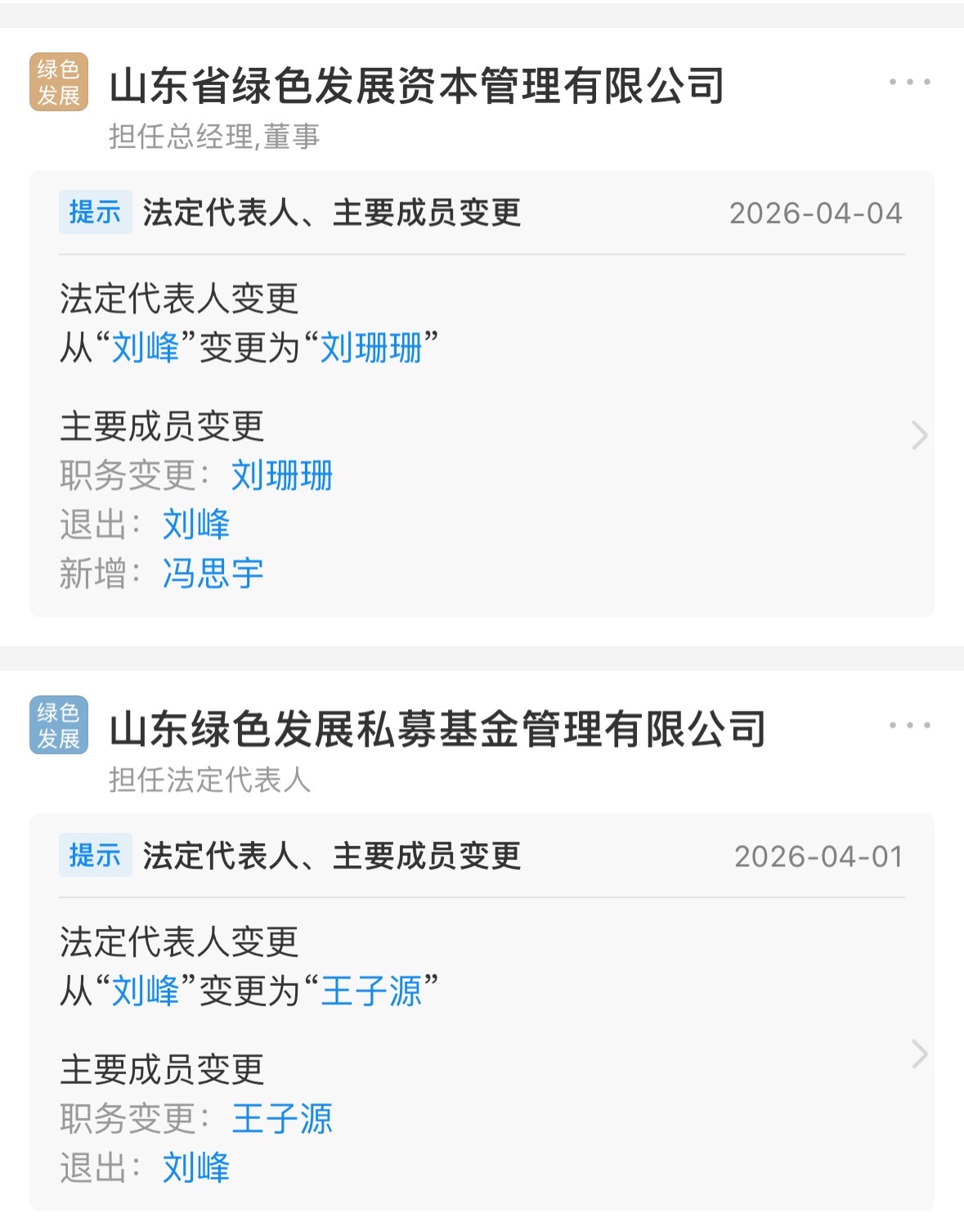 值得关注的是,同一体系内另有一场交接:刘峰还卸任山东省绿色发展资本管理有限公司(下称“山东绿色资本”)董事长一职,董事刘珊珊升任董事长;山东绿色资本同时新增董事冯思宇。