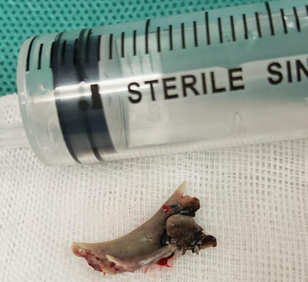 面对这一复杂情况,手术团队临危不乱,迅速调整治疗策略,充分发挥呼吸介入技术优势,采用气道内激光对异物进行精准切割。术中,团队操作精准、配合默契,利用激光将嵌顿的鸡骨平稳切割为两部分,再用异物钳将分割后的骨块逐一小心取出,整个手术过程紧张有序,最终成功将异物完整清除,彻底解除了患者的气道梗阻。目前,患者术后恢复良好,咳嗽咳痰症状已明显缓解。