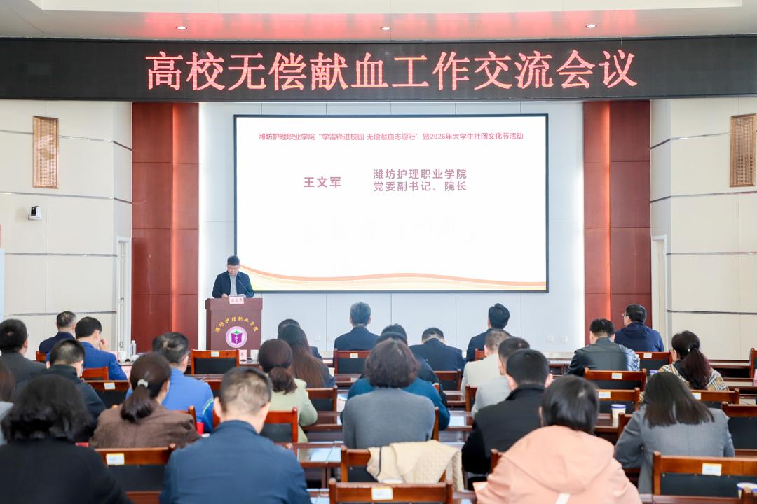 4月10日,潍坊护理职业学院举办“学雷锋进校园 无偿献血志愿行”暨2026年大学生社团文化节活动,青岛市高等院校和技工院校代表参会。同期举行的高校无偿献血工作交流会议由潍坊护理职业学院党委委员、副院长窦忠伟主持。
