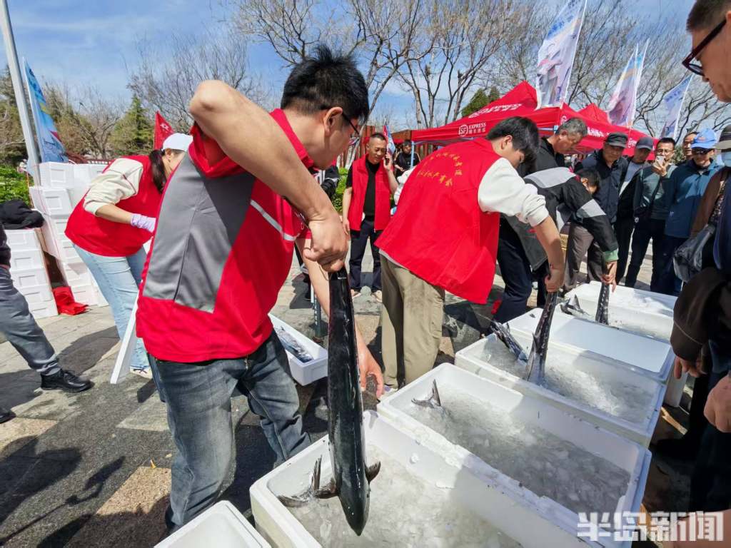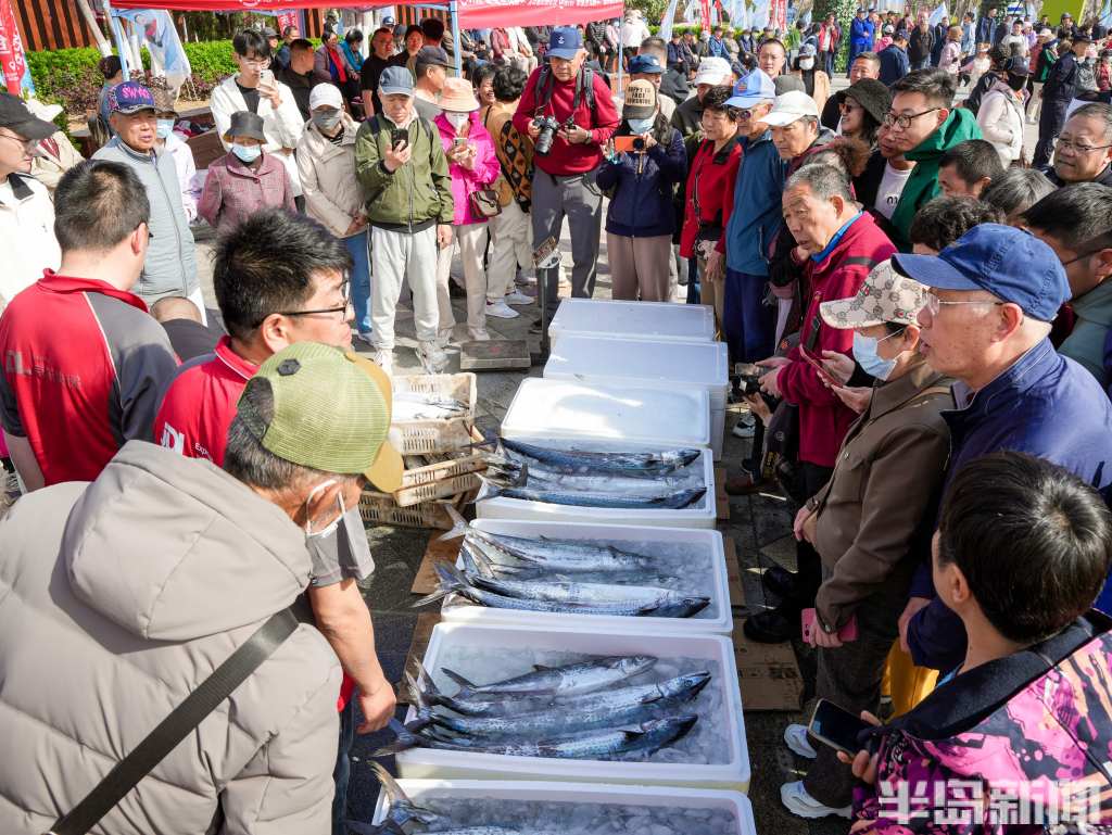 崂山区水产商会在舞台一侧摆开了摊儿,新鲜的大鲅鱼往冰水里一放,一溜儿摆开,很快就围满了人。