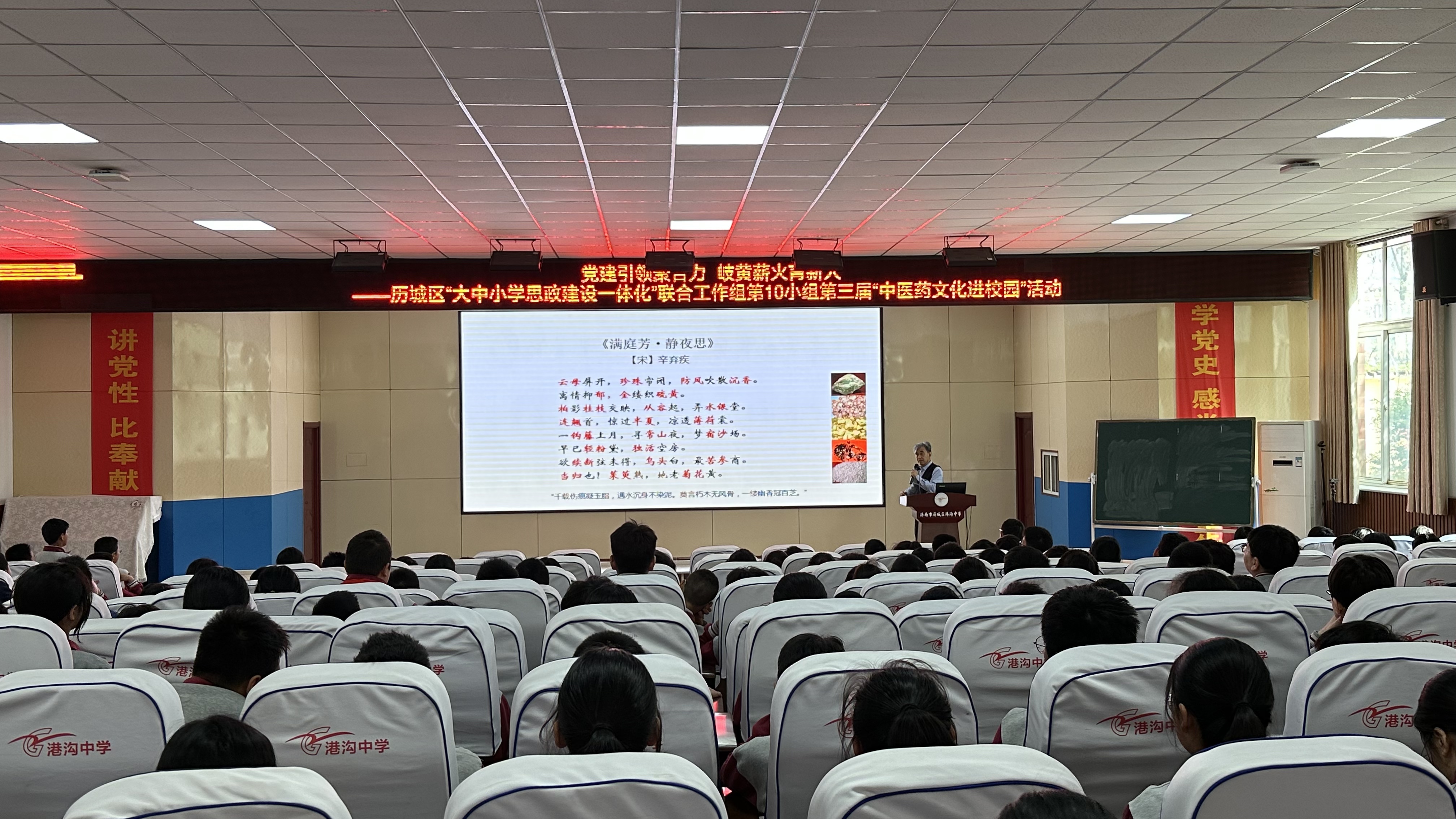 为深化基层党组织结对共建实效,推动中华优秀传统文化浸润校园,4月10日上午,历城区“大中小学思政建设一体化”联合工作组第10小组走进历城区港沟中学,举办“党建共建聚合力 岐黄薪火育新人”中医药文化进校园活动。活动以党建为引领、以文化为纽带,将中医药文化普及与思政教育深度融合,为青少年学生送上了一堂兼具知识性、实践性与文化性的特色课堂。
