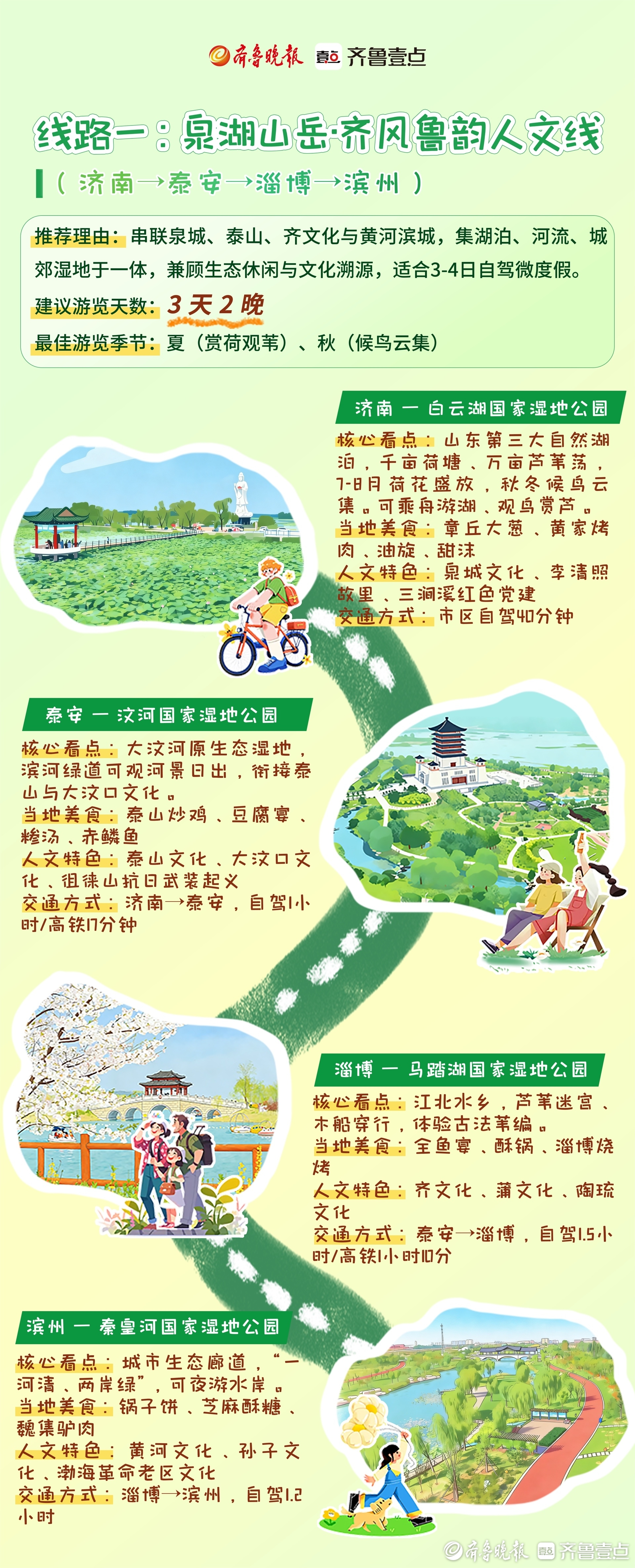 2026年4月13日至19日,山东迎来第二个湿地保护宣传周。今年宣传周期间,山东省自然资源厅、山东省林业保护和发展服务中心、齐鲁晚报·齐鲁壹点联合面向公众发布4条湿地主题生态旅游推荐线路,涵盖泉湖山岳·齐风鲁韵人文线、拥海踏浪·胶东半岛风情线、烟雨荷香·红色沂蒙研学线、大河之洲·黄河入海奇观线,串联起全省特色湿地资源与人文景观,为公众亲近湿地、体验湿地提供清晰指引。