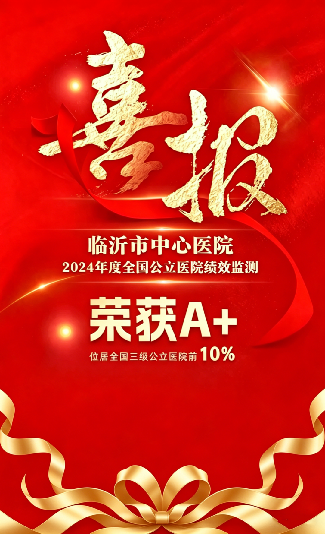 4月9日,国家卫生健康委公布2024年度国家三级公立医院绩效监测结果,临沂市中心医院获评A+等级,位居全国1658家三级公立医院前10%,实现从A到A+的历史性突破。