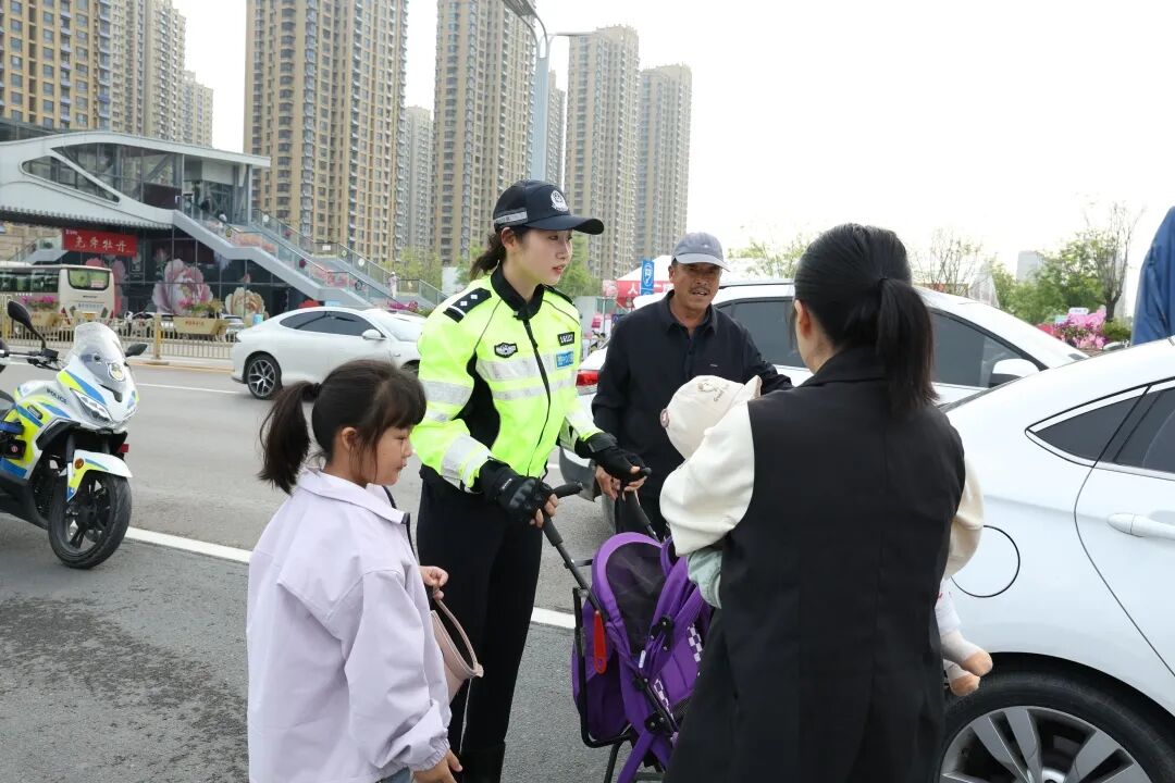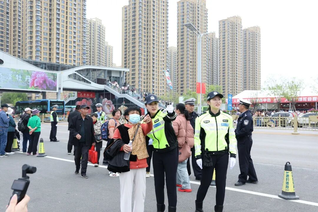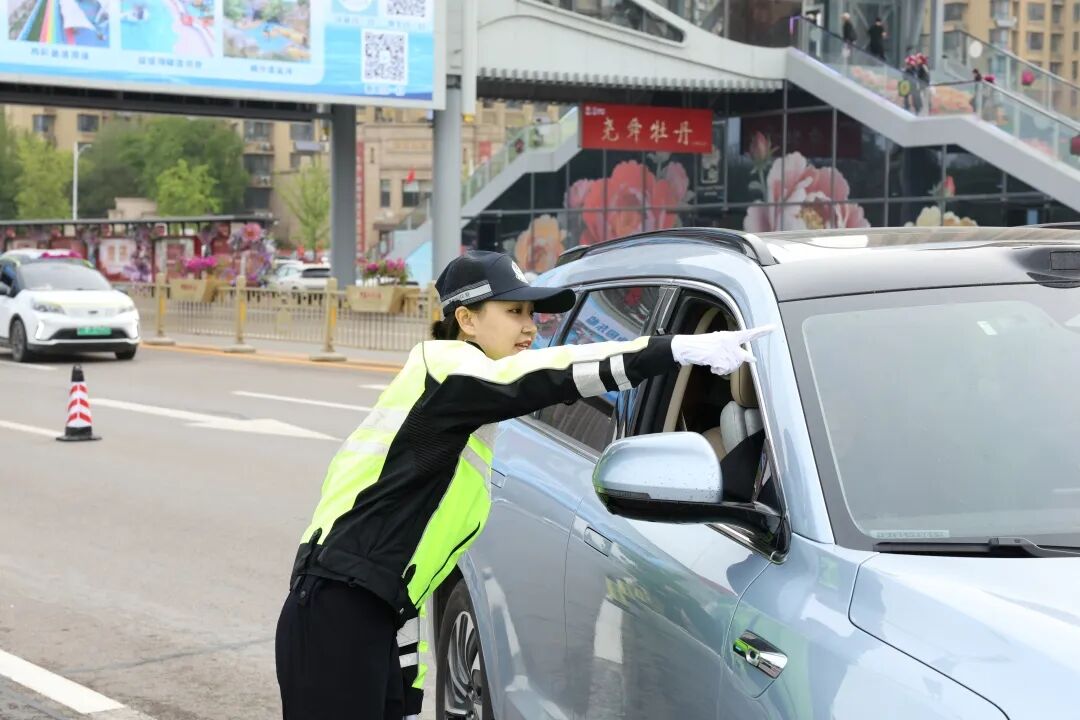 在各大牡丹园周边、主干道节点,执勤民警辅警化身“移动路标”,实行“高峰执勤把守、平峰动态巡控”模式。针对开幕式等重点活动,增派铁骑巡逻队,快速处置各类突发警情,实施“远端分流、中端管控、核心保通”三级策略,确保核心区域交通平稳有序,让游客“行得顺、停得下”。