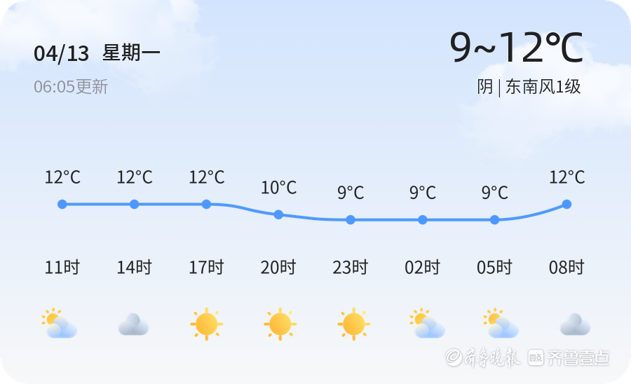 今天是4月13日,星期一,农历二月廿六。威海市今日天气阴沉,气温介于9℃至12℃之间,东南风1级,空气湿度55%。AQI指数为54,属于良好级别,适合户外活动。市民外出时建议携带雨具,以防天气突变。清晨气温较低,早起的市民请注意添衣保暖。