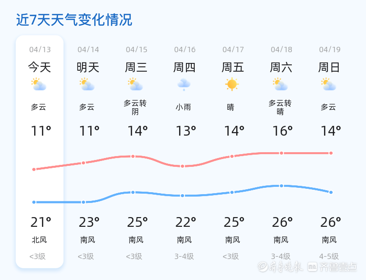 今天是4月13日,星期一,农历二月廿六。聊城地区天气多云,气温在11°C到21°C之间,东风1级,空气湿度为82%,PM2.5指数为36。各区天气情况总体相似,多云为主,适合市民外出活动。nn明天4月14日,聊城天气仍为多云,但气温有所上升,最低气温11°C,最高气温23°C,风向转为南风,风力依然较弱。与今日相比,天气状况基本保持稳定,但温度略有上升,市民需注意及时增减衣物。nn未来三天,聊城天气变化较为明显。4月15日,天气多云转阴,气温在14°C到25°C之间;4月16日,将迎来小雨天气,气温下降至13°C到22°C,风力有所增强,达到3-4级。4月17日,天气转晴,气温回升至14°C到25°C。市民需根据天气变化及时调整衣物,特别是雨天出行时,建议携带雨具,注意防风保暖。nn温馨提示