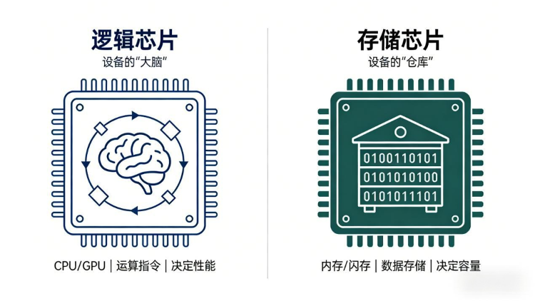 逻辑芯片和存储芯片的区别。图片来源:AI生成
