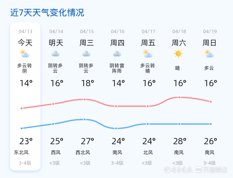 今日是4月13日,星期一,农历二月廿六,济南迎来多云天气,气温介于14℃至23℃之间。目前时间为早上6点,温度为14.5℃,南风1级,相对湿度60%,空气质量良好,PM2.5指数为41。今日济南各区天气状况总体平稳,以多云为主,局部地区可能有短暂阴云,但整体不会对市民日常生活造成太大影响。