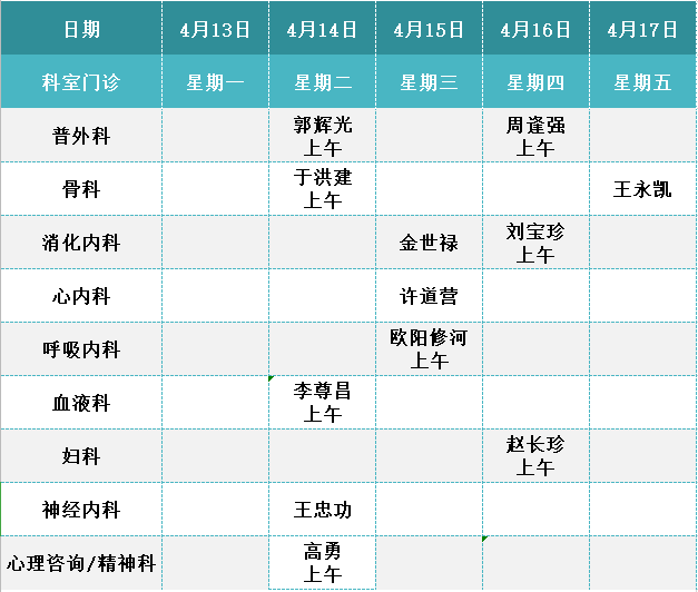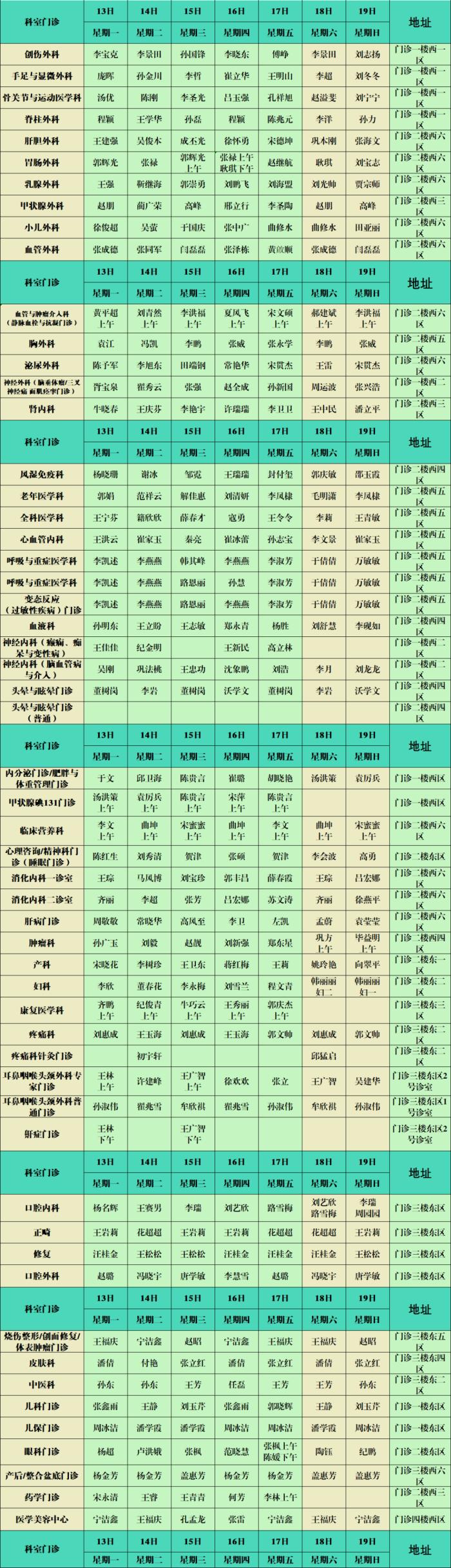 滨州市人民医院4月13日-19日门诊医生值班表